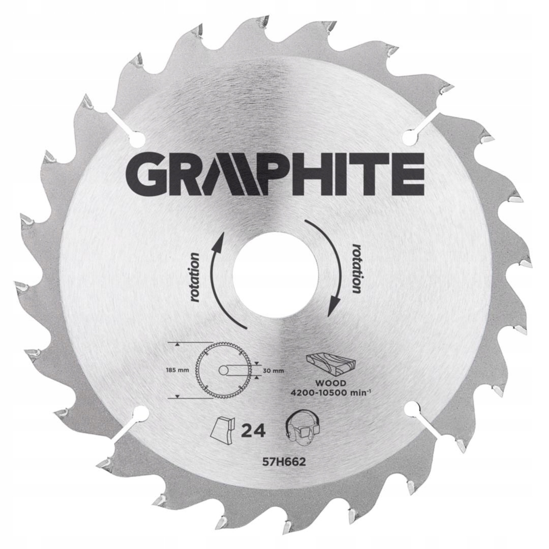 Tarcza do pilarki widiowa GRAPHITE (nr ref. 57H662) o średnicy zewnętrznej 185 mm, wykonana ze stopu stali manganowej MN65 o dużej odporności na temperaturę i odkształcenia. Zęby z nakładkami z węglika spiekanego YG6A pozwalają na zgrubne cięcie drewna i materiałów drewnopochodnych, takich jak sklejka, płyta wiórowa, MDF. Zawarte w opakowaniu pierścienie redukcyjne umożliwiają zastosowanie tarczy do większości modeli pilarek.