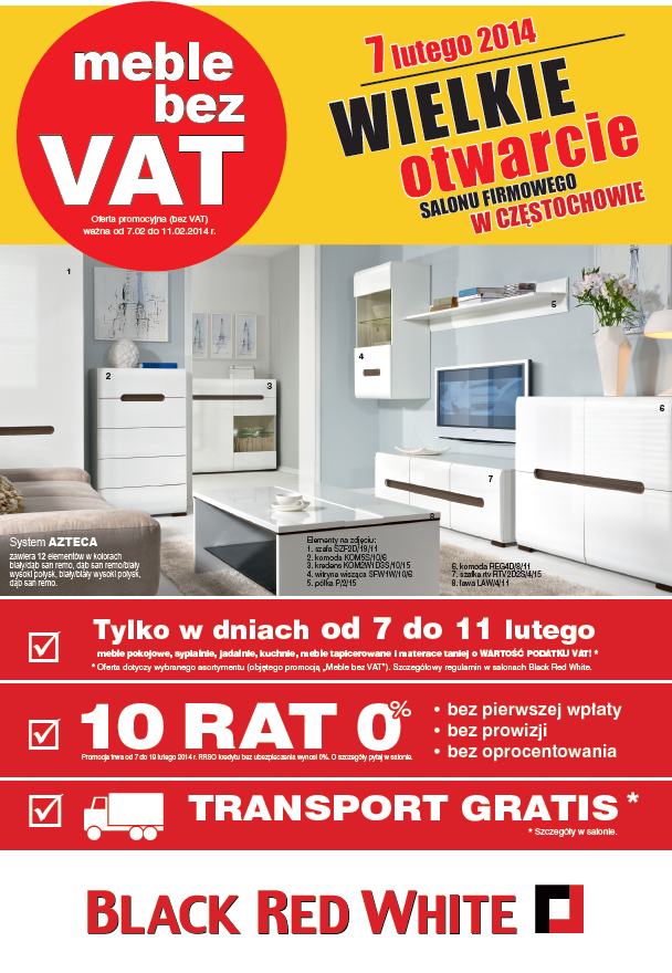 Otwarcie nowego salonu Black Red White w Częstochowie to idealna okazja, by skorzystać z wyjątkowych obniżek cenowych. W dniach 7 - 11 lutego meble pokojowe, sypialnie, jadalnie, kuchnie, meble tapicerowane i materace będą tańsze o wartość podatku VAT. Co więcej, Klienci będą mogli kupić cały asortyment w 10 ratach 0%, a zakupione produkty zostaną do nich dostarczone bezpłatnie!