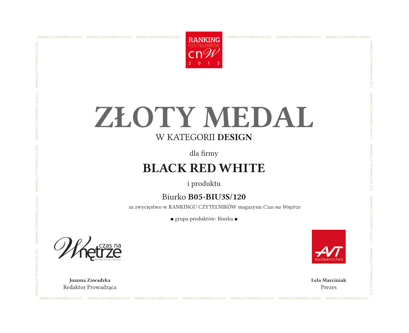 Firma Black Red White została nagrodzona Złotym Medalem Grand Prix w Rankingu Czytelników magazynu Czas na Wnętrze za Biurko B05-BIU3S/120. Spółka zdobyła jednocześnie Złoty Medal za zdobycie pierwszego miejsca w kategorii Design.