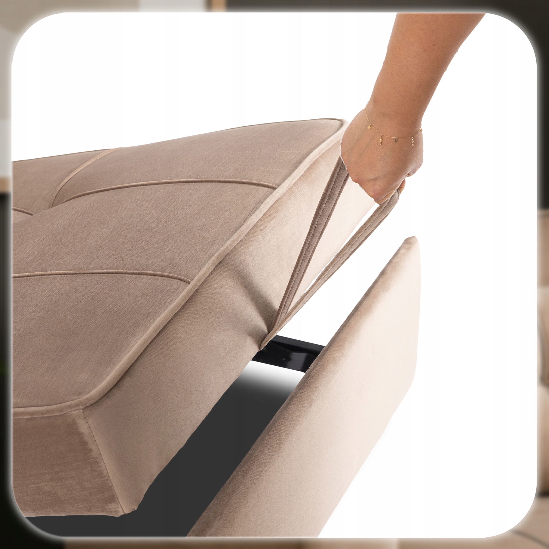 - Wytrzymała tapicerka welurowa – tkanina odporna na mechacenie i przetarcia, a jednocześnie miękka i przyjemna w dotyku, co gwarantuje komfort codziennego użytkowania.