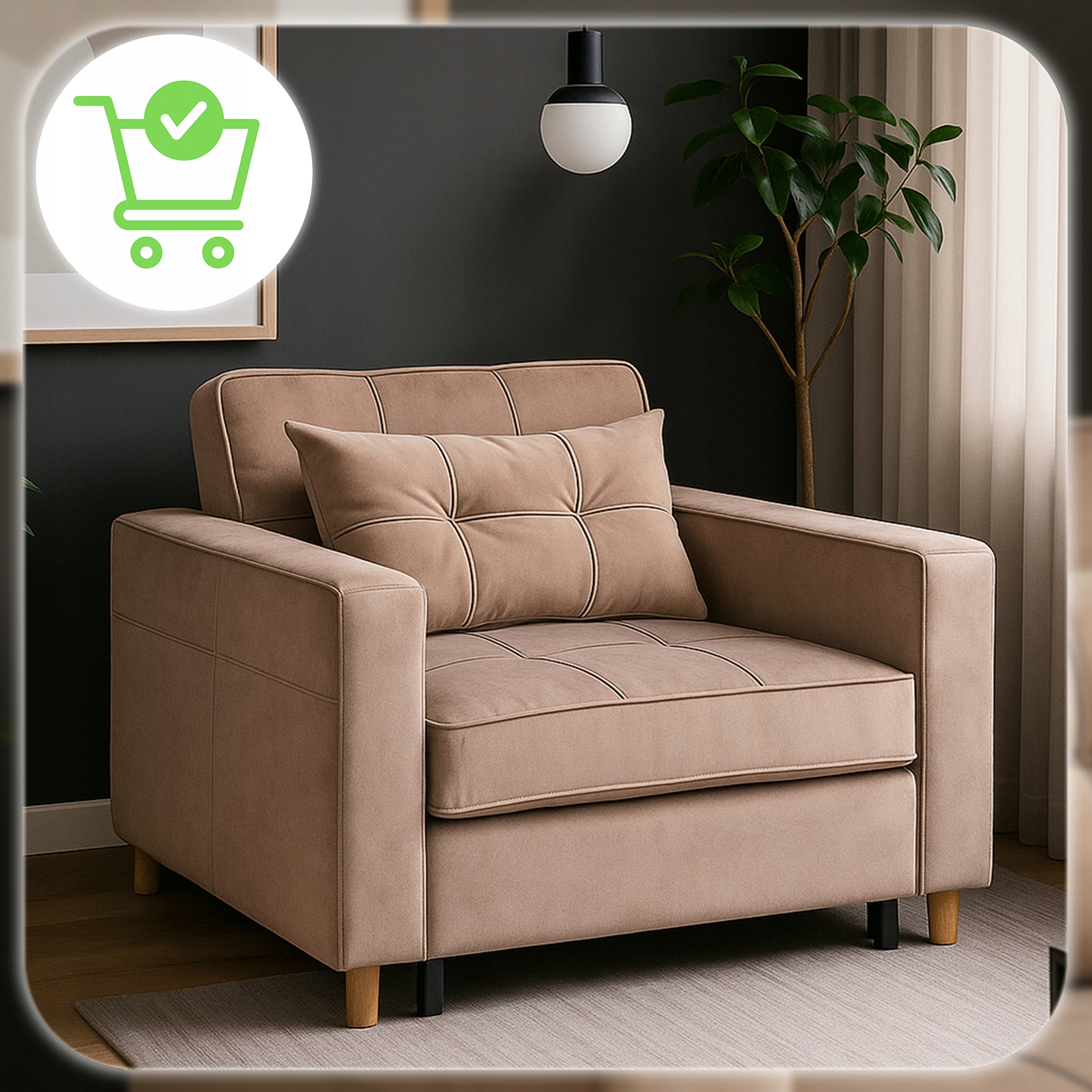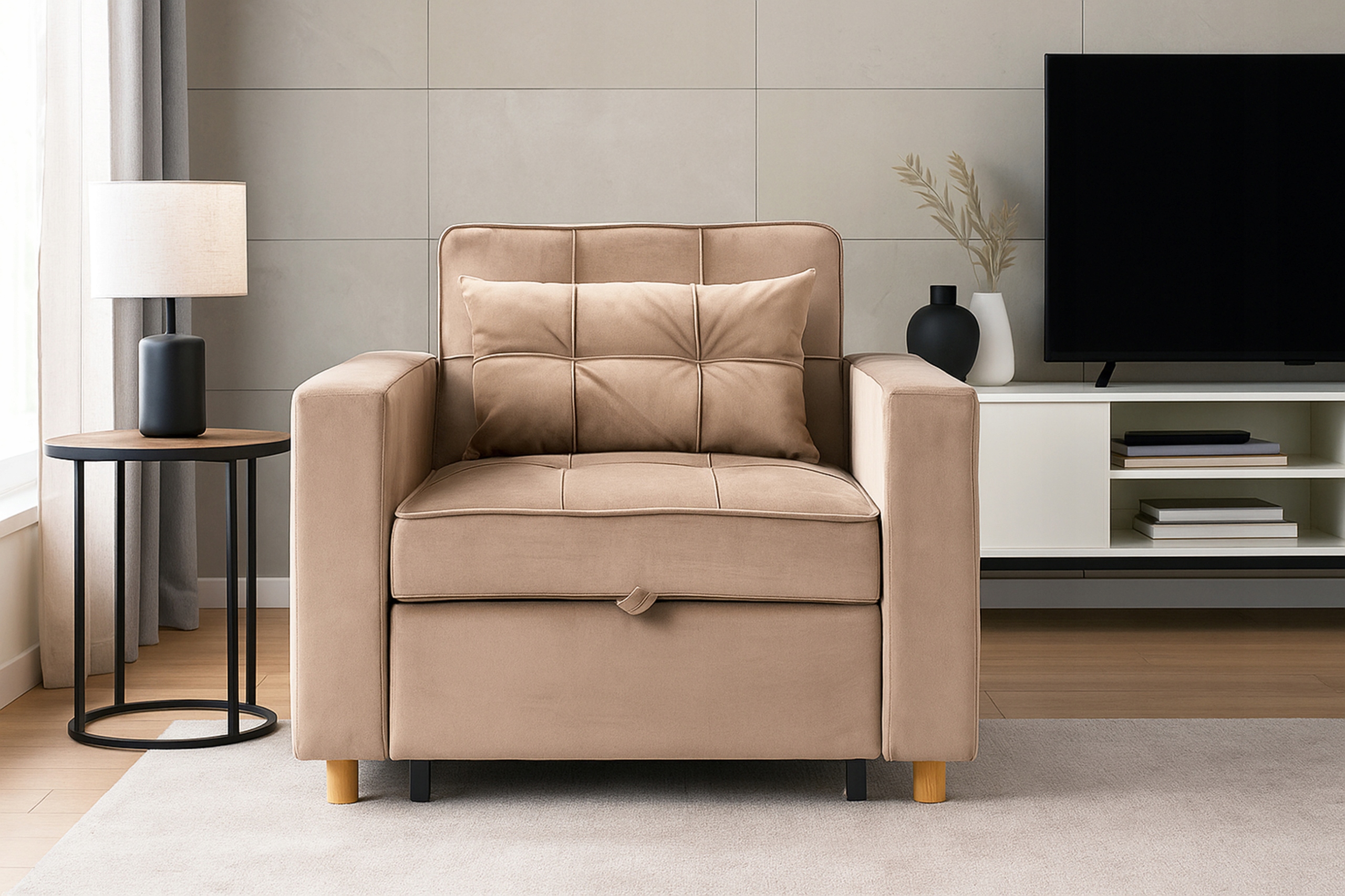 Ten fotel rozkładany łączy elegancję z funkcjonalnością – w kilka chwil zmienia się w wygodne łóżko. Świetnie sprawdzi się w salonie, sypialni, pokoju gościnnym, a także w hotelach.