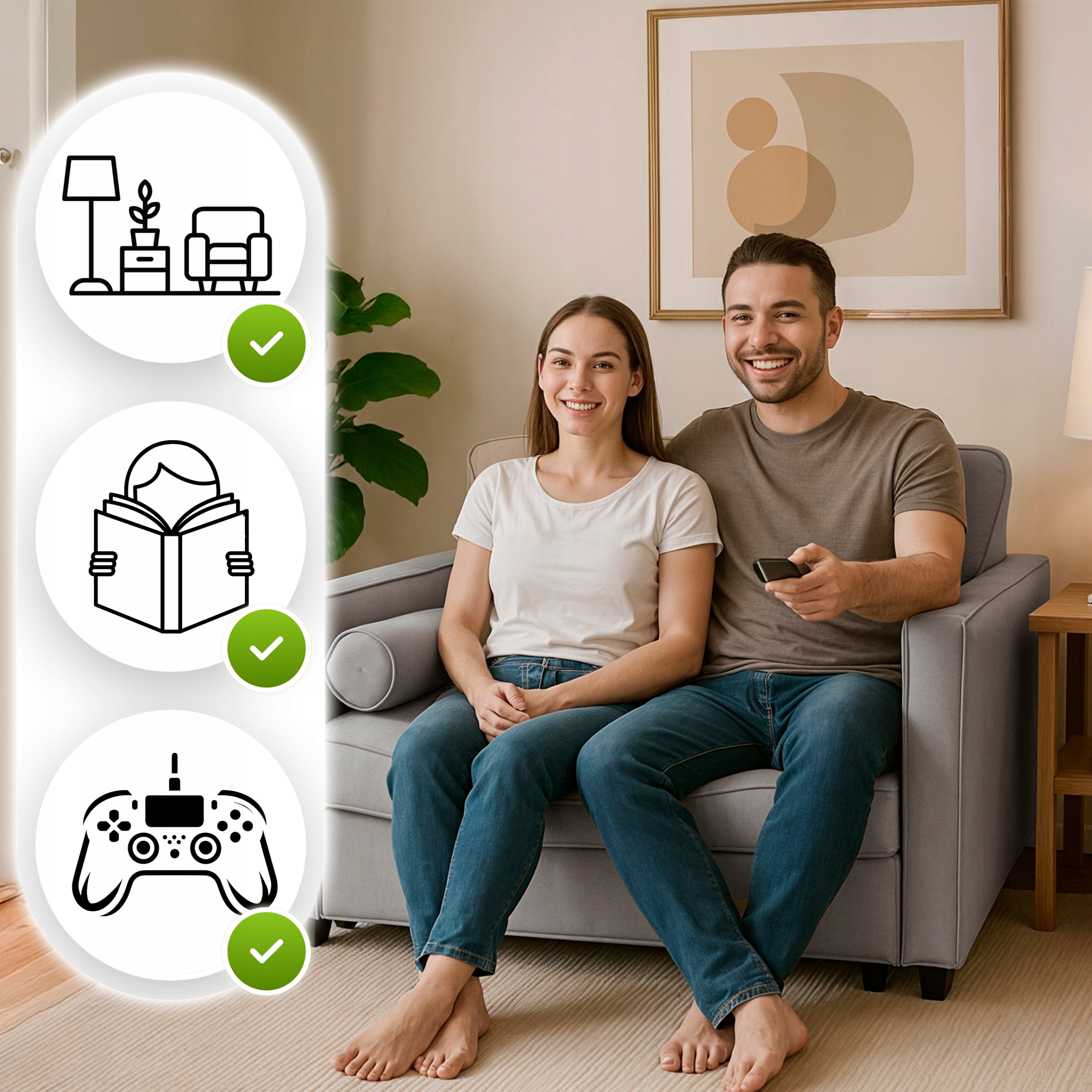 - Dla fanów filmów i seriali – rozkładane oparcie i podnóżek pozwalają przyjąć pozycję półleżącą, zmniejszając napięcie w ciele i dając pełen relaks podczas seansu.