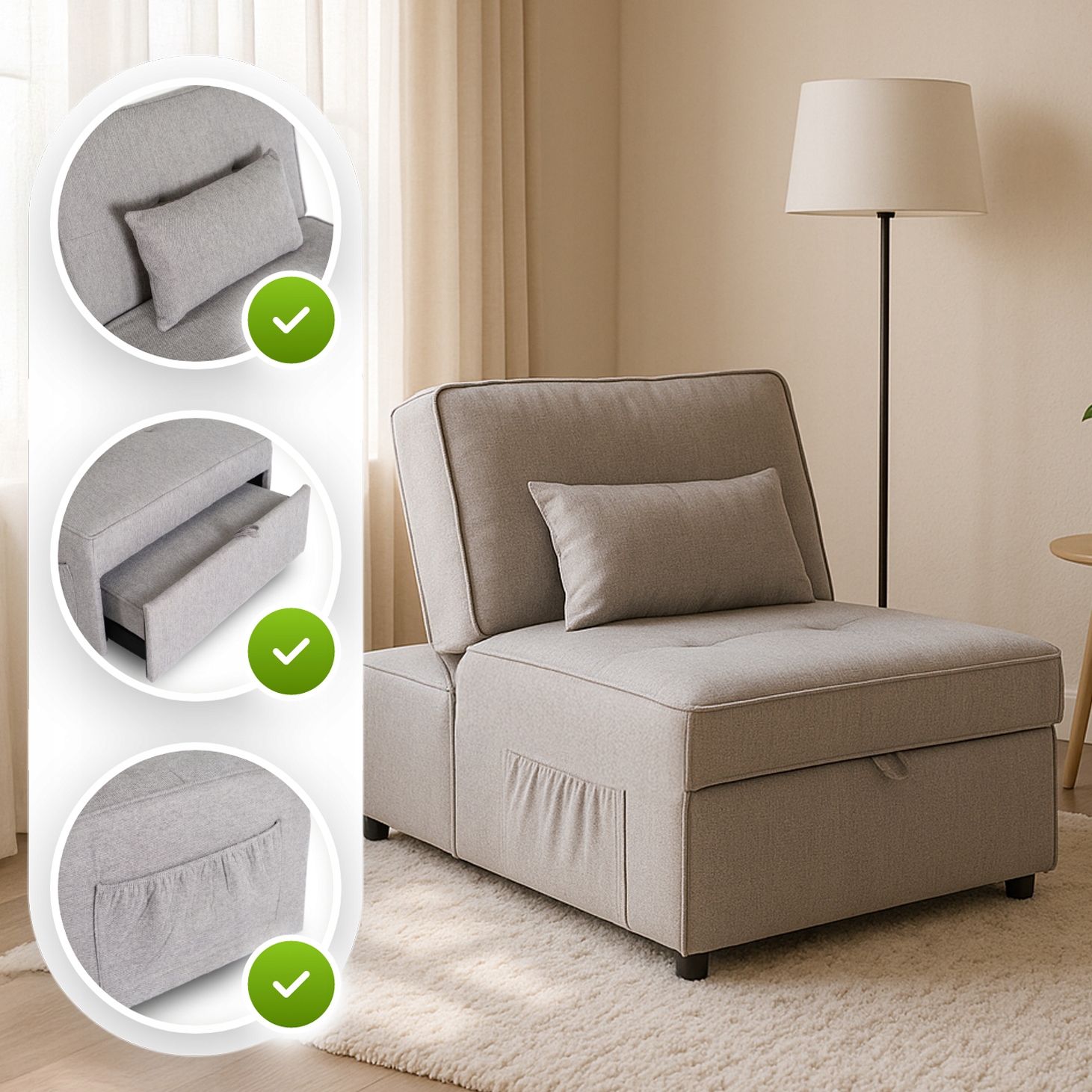 - Wszechstronność 3w1 – fotel, leżanka i łóżko w jednym. Dzięki systemowi wysuwania dolnego segmentu z mechanizmem wspomagającym rozkładanie, zmiana formy trwa zaledwie kilka sekund.