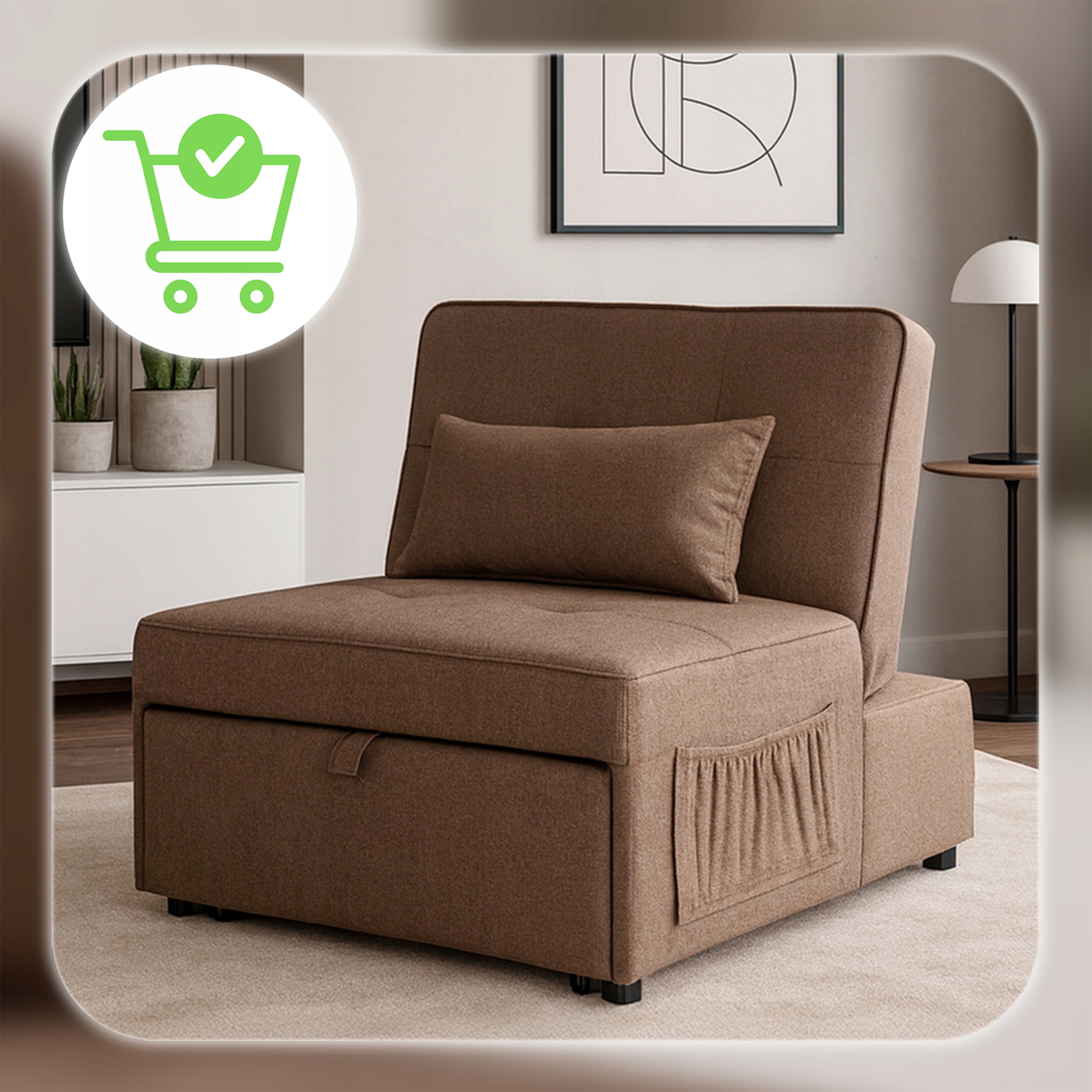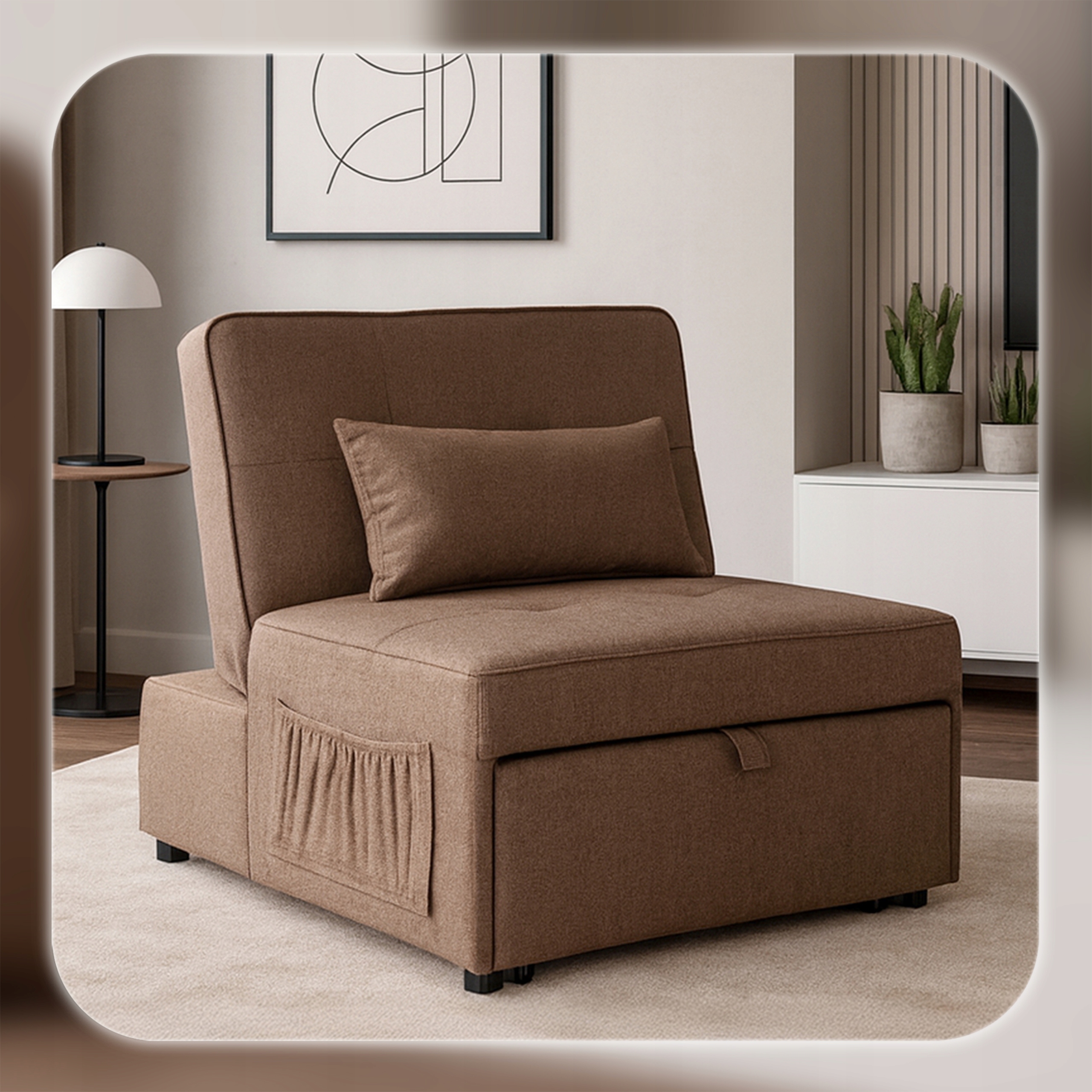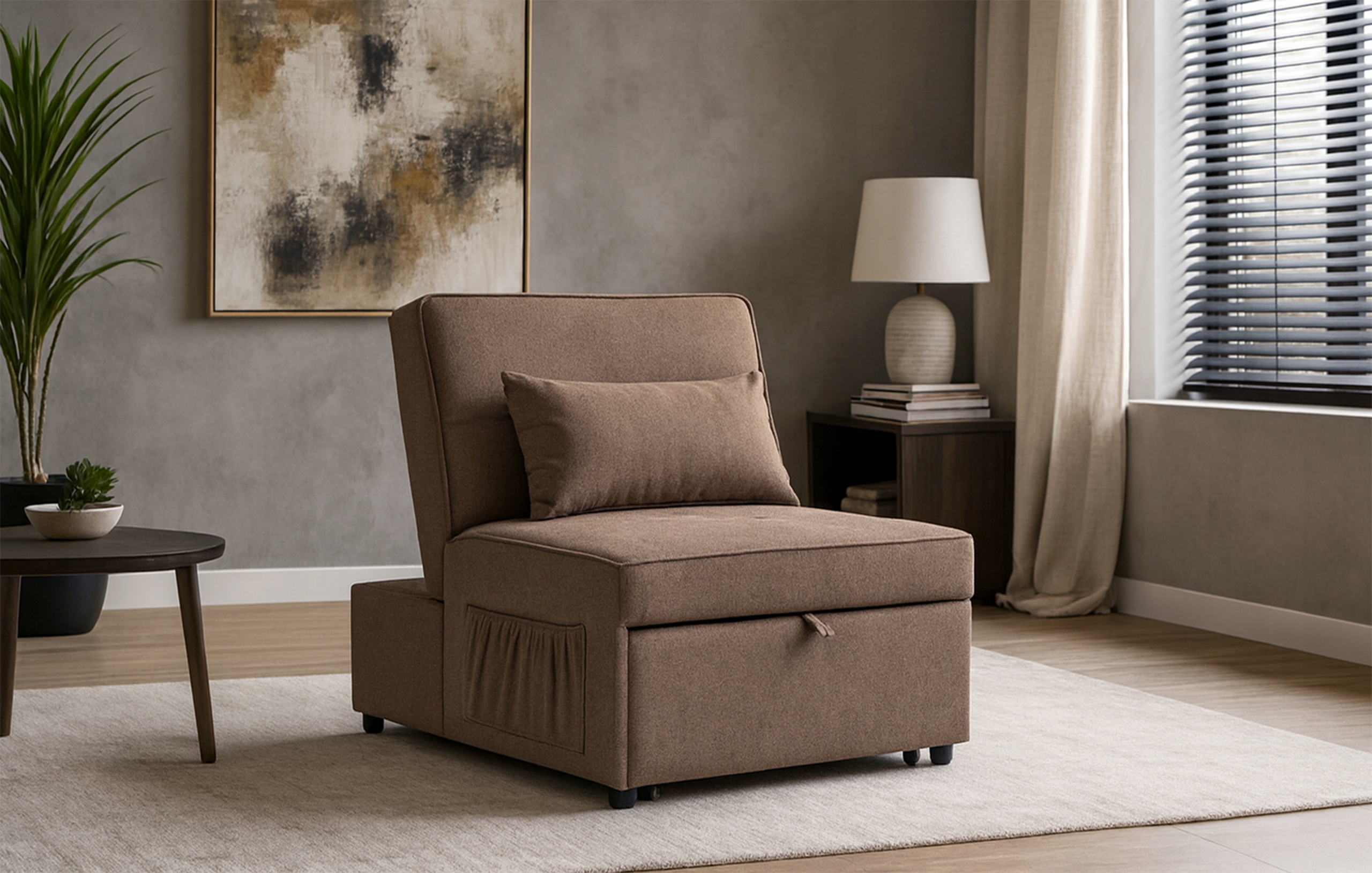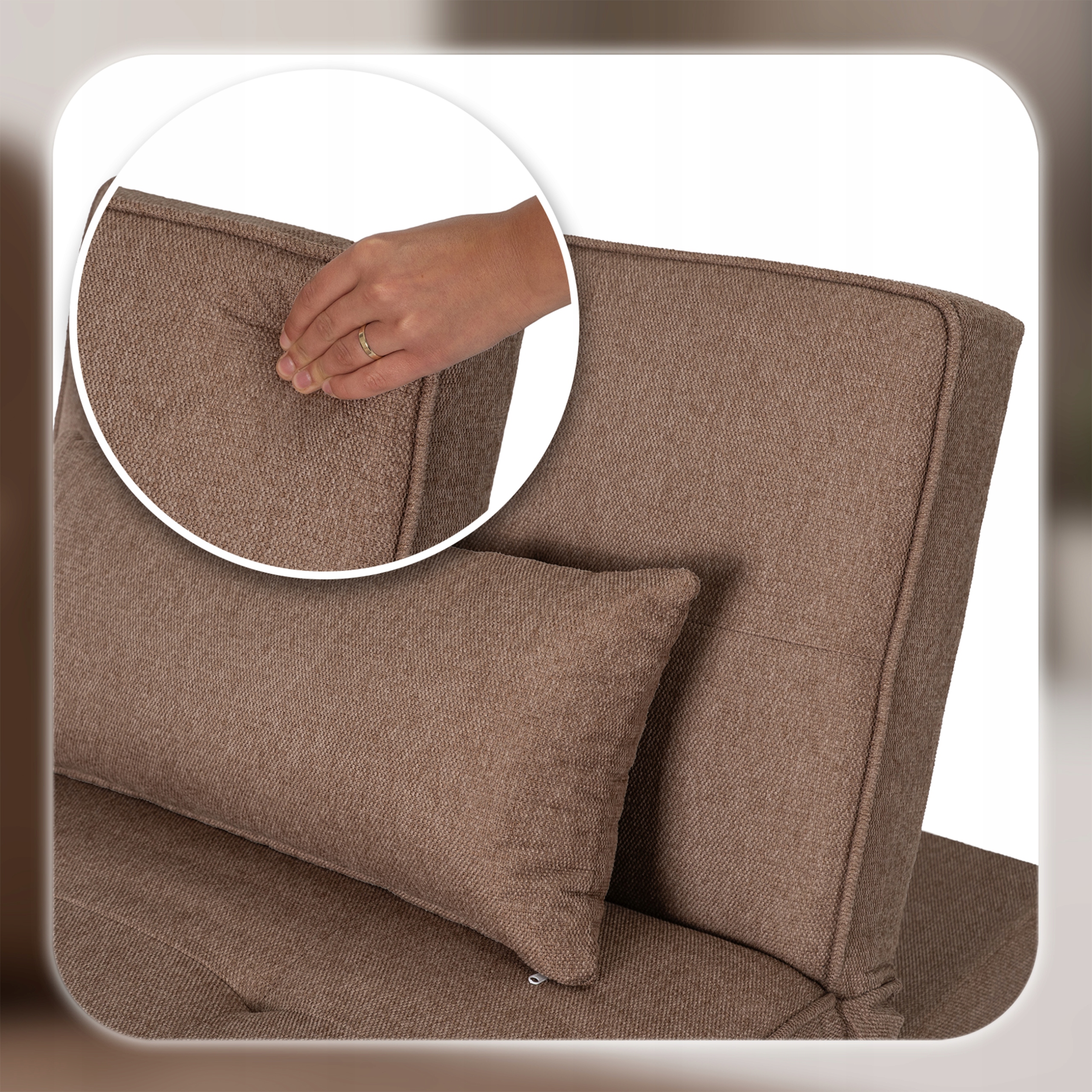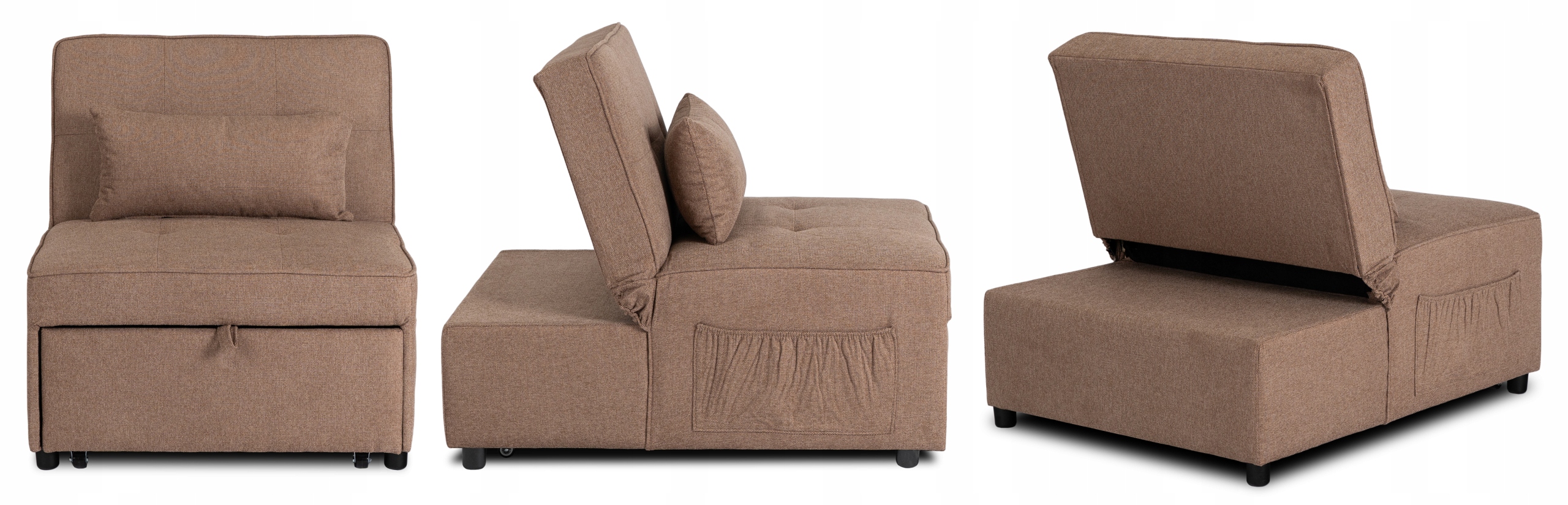 Fotel IBERIS w kolorze brązowym to doskonałe połączenie komfortu i praktyczności. W kilka chwil zmienia się z klasycznego fotela w leżankę lub wygodne łóżko, oferując trzy poziomy rozłożenia, które idealnie dopasujesz do swoich potrzeb – od popołudniowego relaksu, przez seans filmowy, aż po nocny odpoczynek.