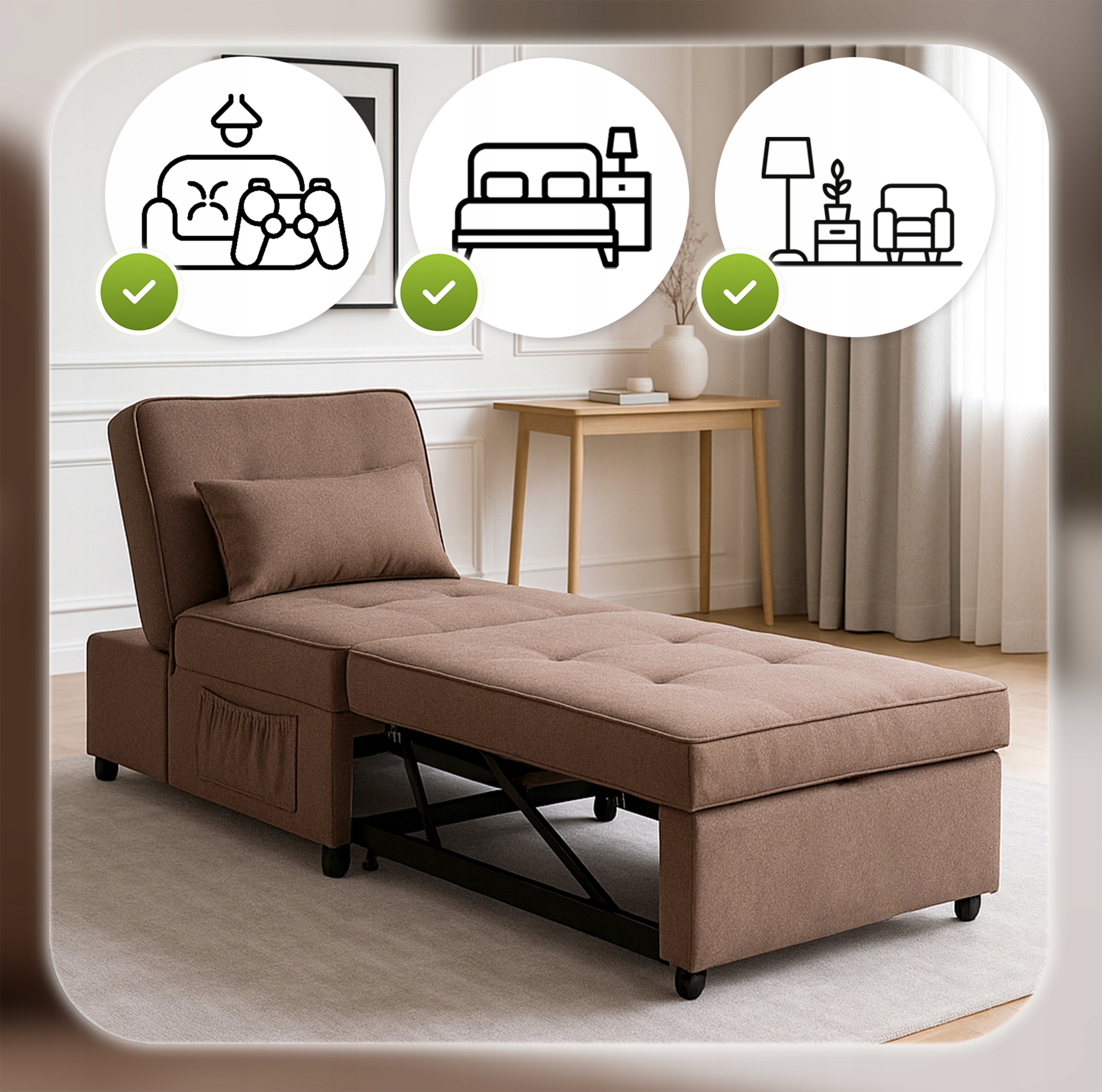 - W kawalerce lub małym mieszkaniu – oszczędza przestrzeń, łącząc trzy funkcje w jednym: fotel, leżankę i łóżko.