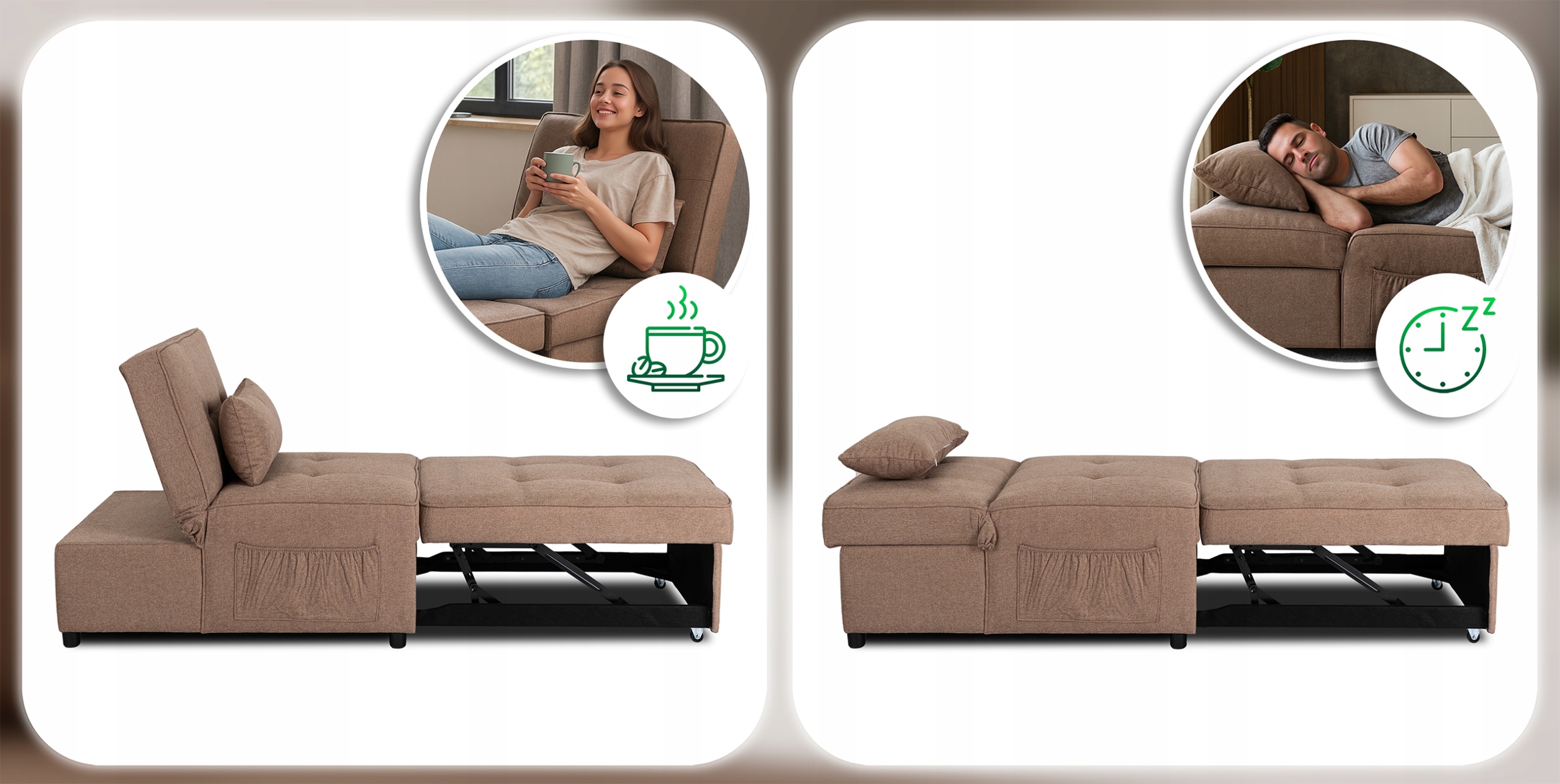 - Popołudniową drzemkę – szybka zmiana w praktyczne łóżko daje Ci miejsce na regenerację bez potrzeby rozkładania dodatkowego mebla.