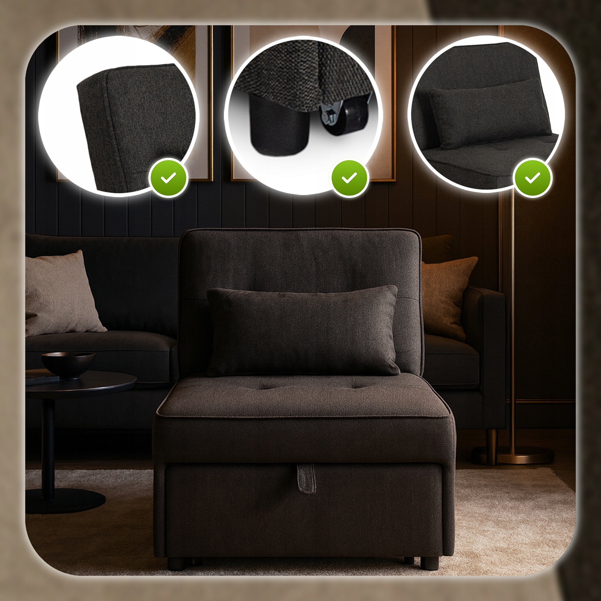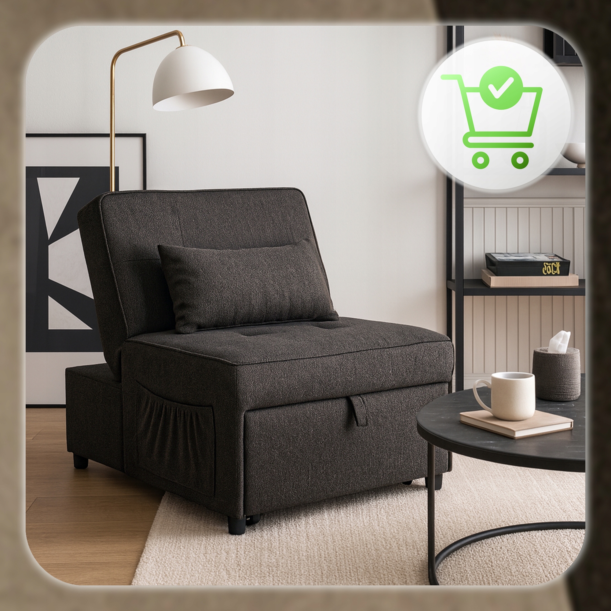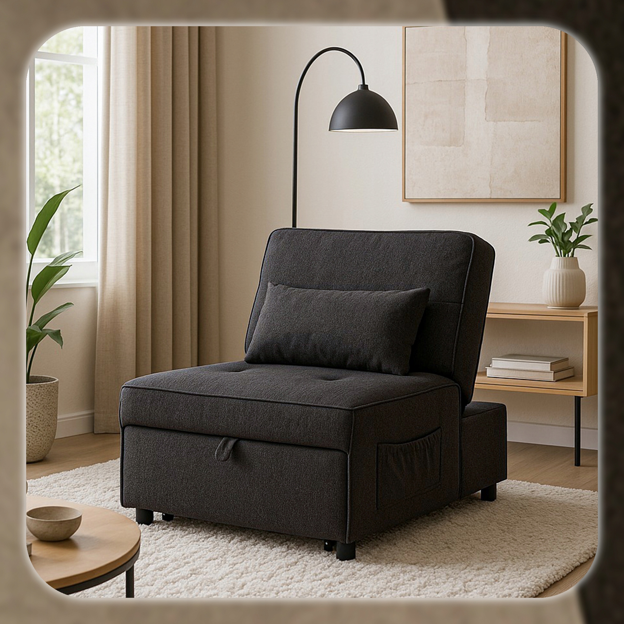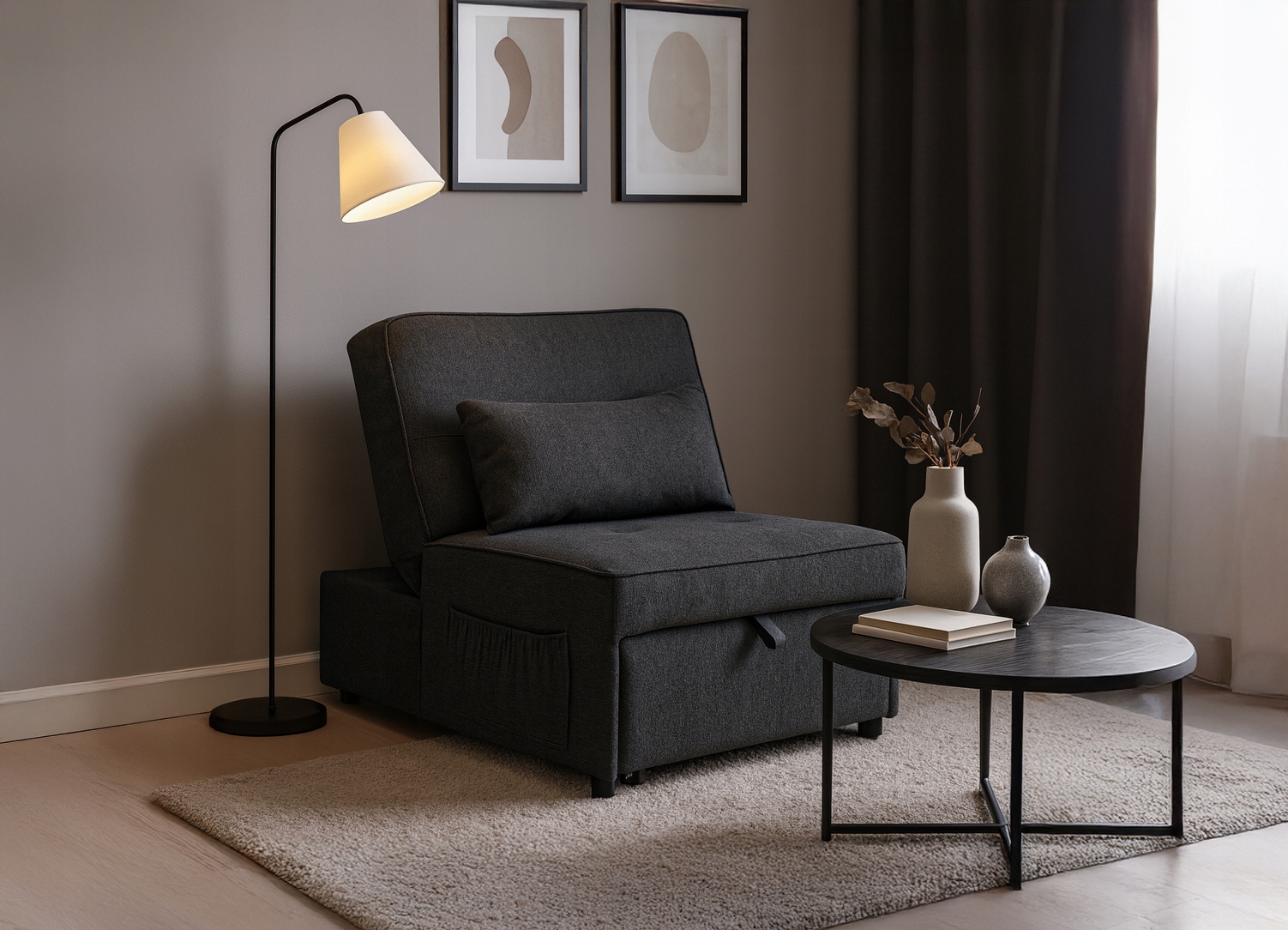 Ten fotel rozkładany łączy elegancję z funkcjonalnością – w kilka chwil zmienia się w wygodne łóżko. Świetnie sprawdzi się w salonie, sypialni, pokoju gościnnym, a także w hotelach.