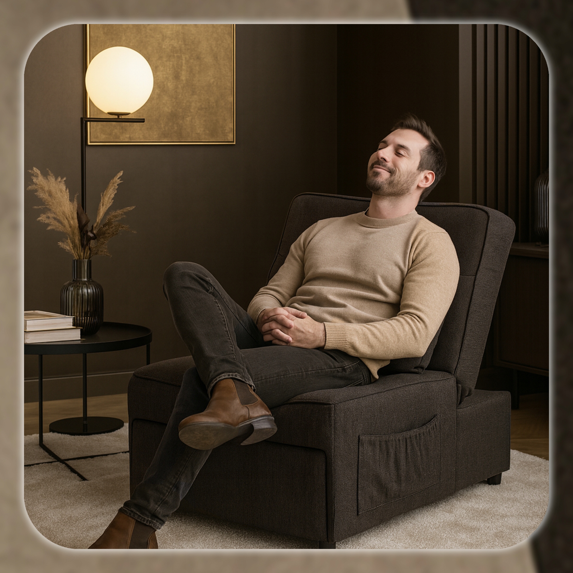 IBERIS to nie tylko klasyczny fotel – łączy trzy funkcje w jednym: fotel, leżankę i łóżko. Dodatkowo ma boczne kieszenie, co czyni go wyjątkowo funkcjonalnym.