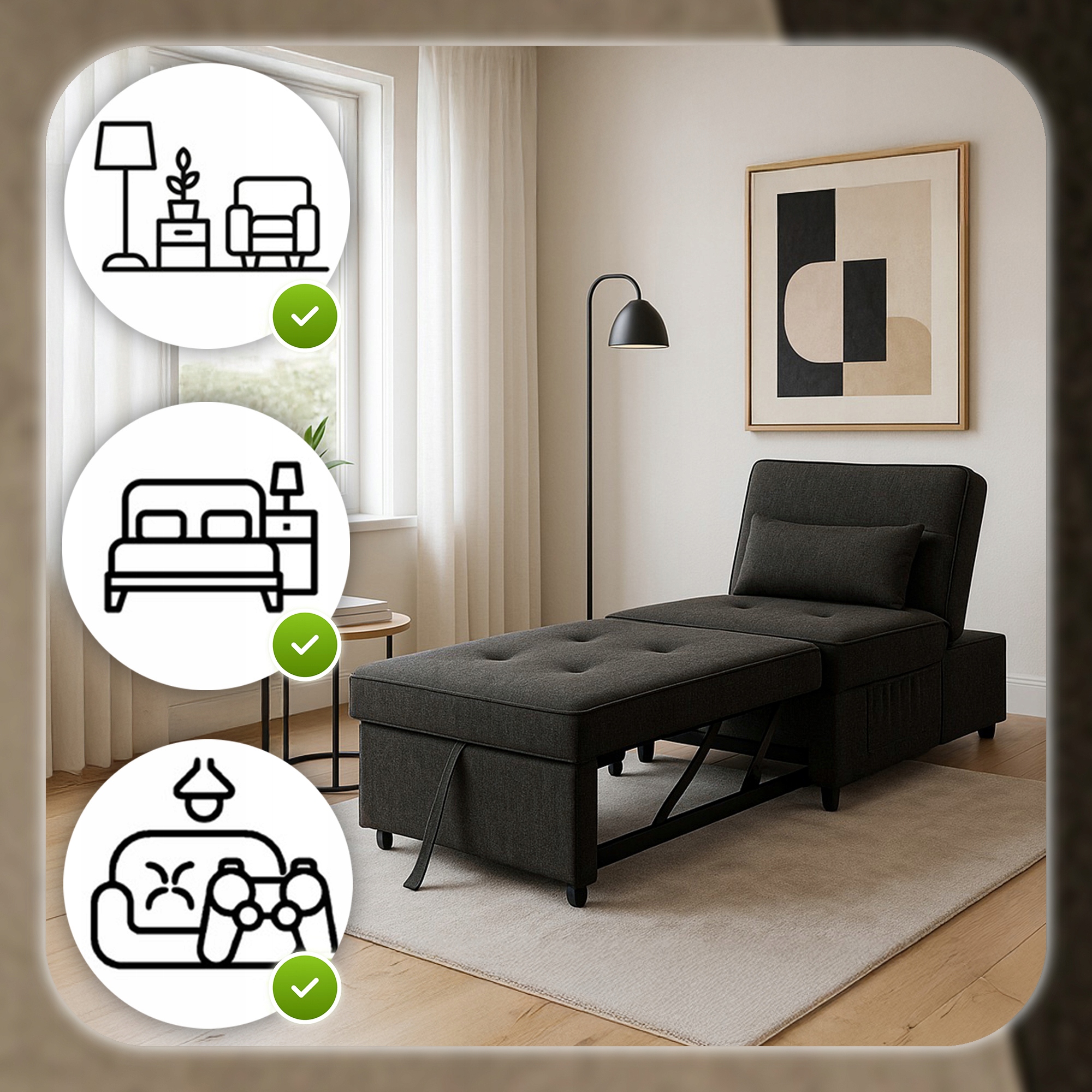 Fotel IBERIS w kolorze czarnym to doskonałe połączenie komfortu i praktyczności. W kilka chwil zmienia się z klasycznego fotela w leżankę lub wygodne łóżko, oferując trzy poziomy rozłożenia, które idealnie dopasujesz do swoich potrzeb – od popołudniowego relaksu, przez seans filmowy, aż po nocny odpoczynek.