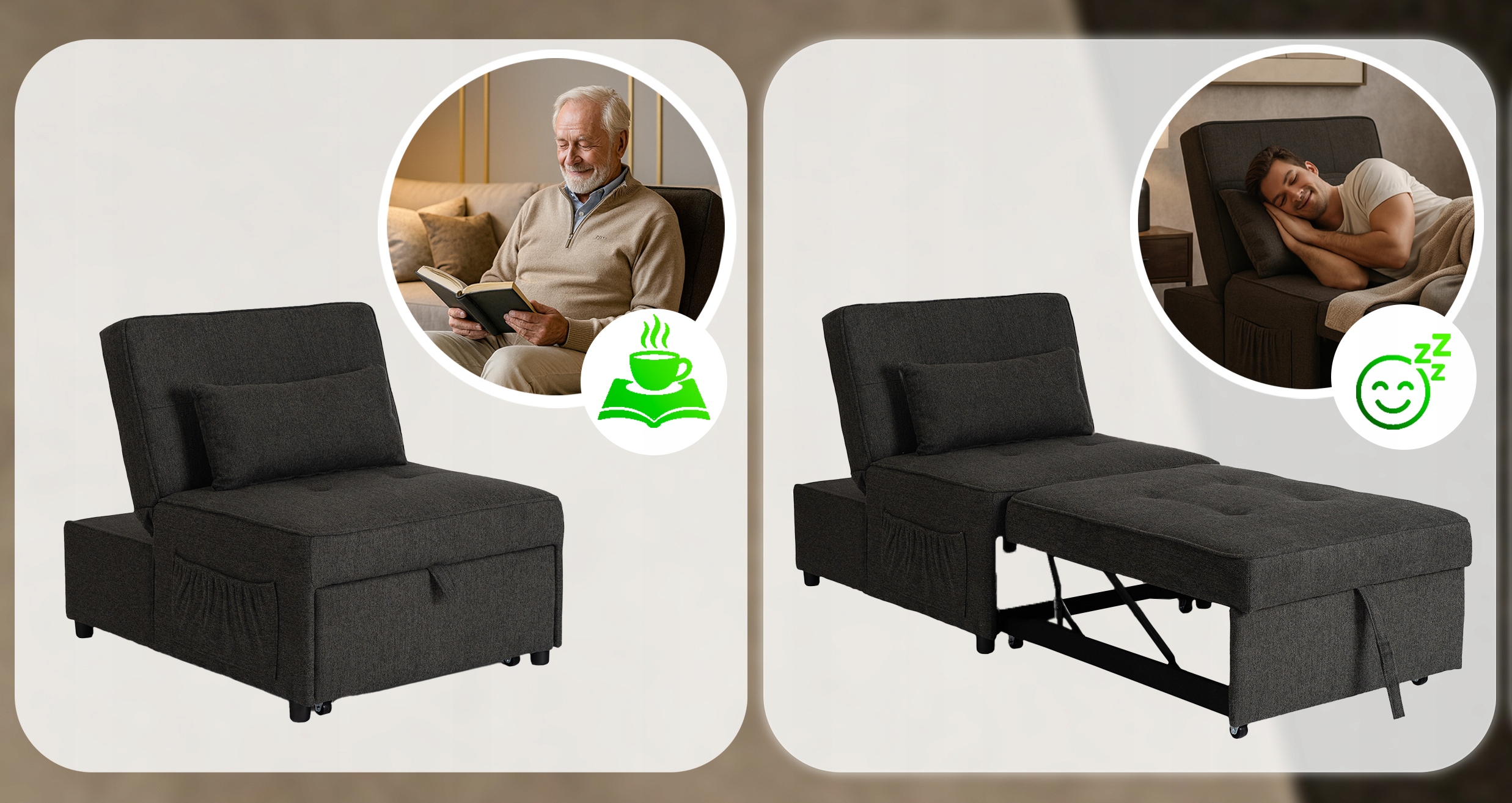 - W kawalerce lub małym mieszkaniu – oszczędza przestrzeń, łącząc trzy funkcje w jednym: fotel, leżankę i łóżko.