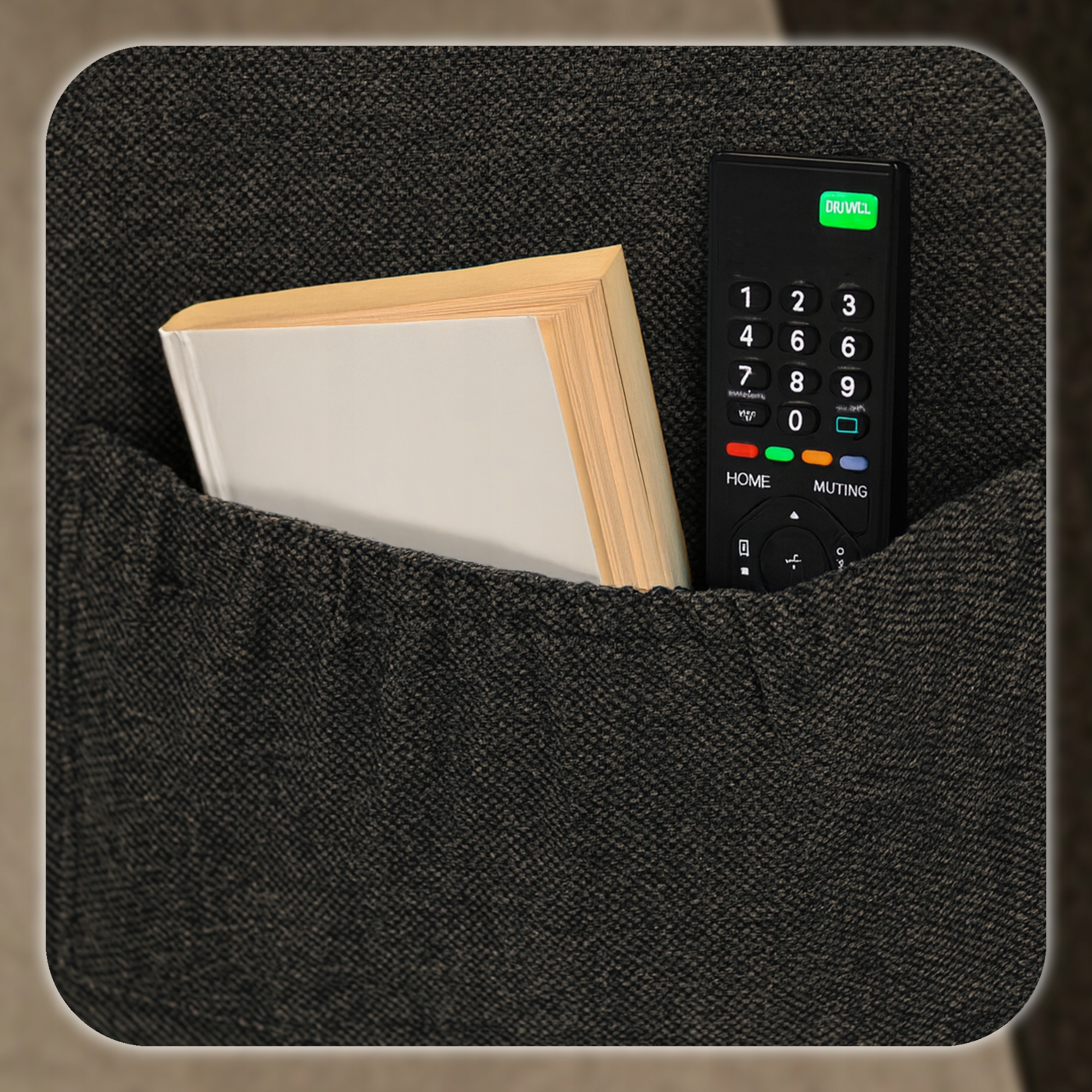 Duże kieszenie po bokach fotela to idealny schowek na najpotrzebniejsze drobiazgi – pilot do telewizora, ulubioną książkę, okulary, ładowarkę. Dzięki temu każdy element masz zawsze pod ręką.