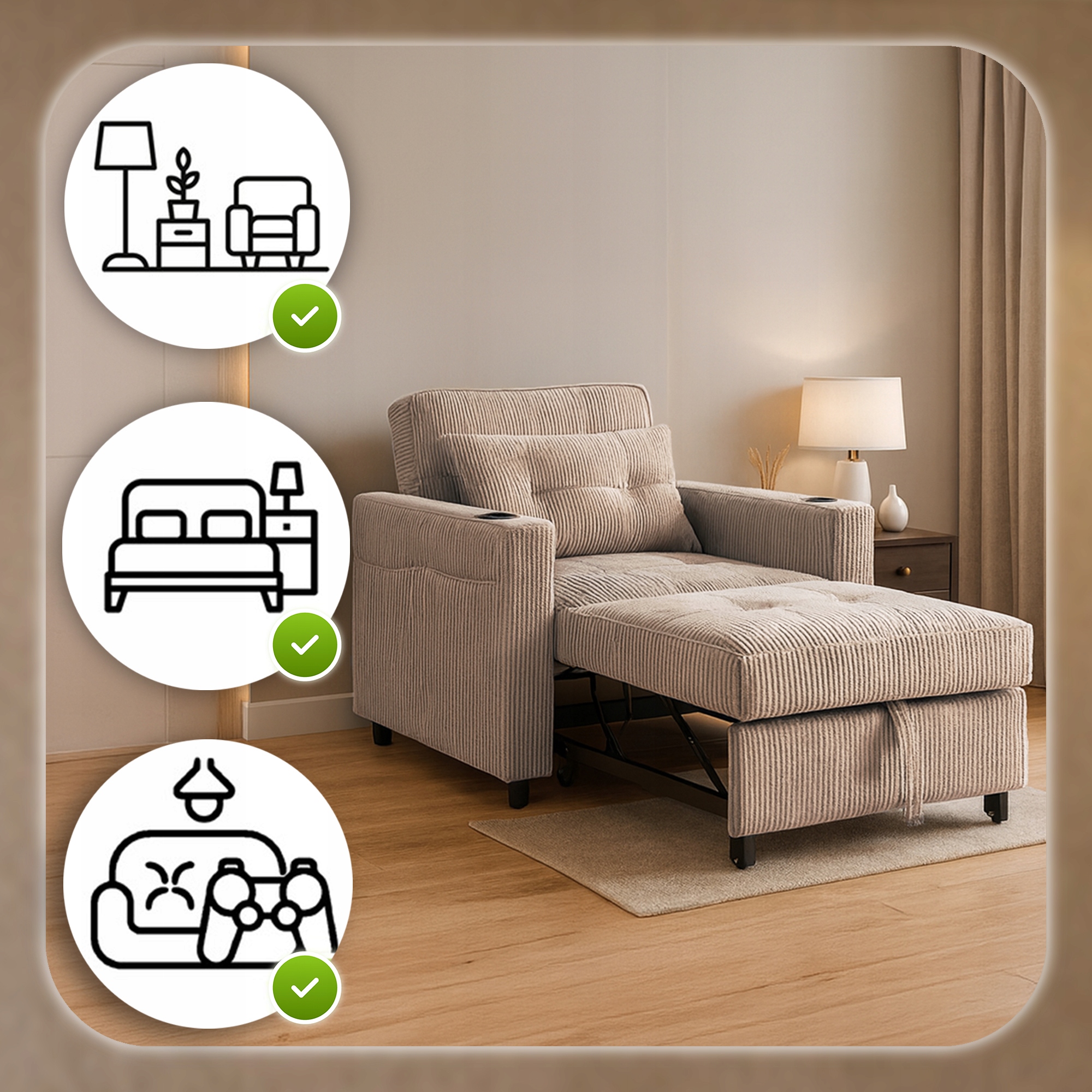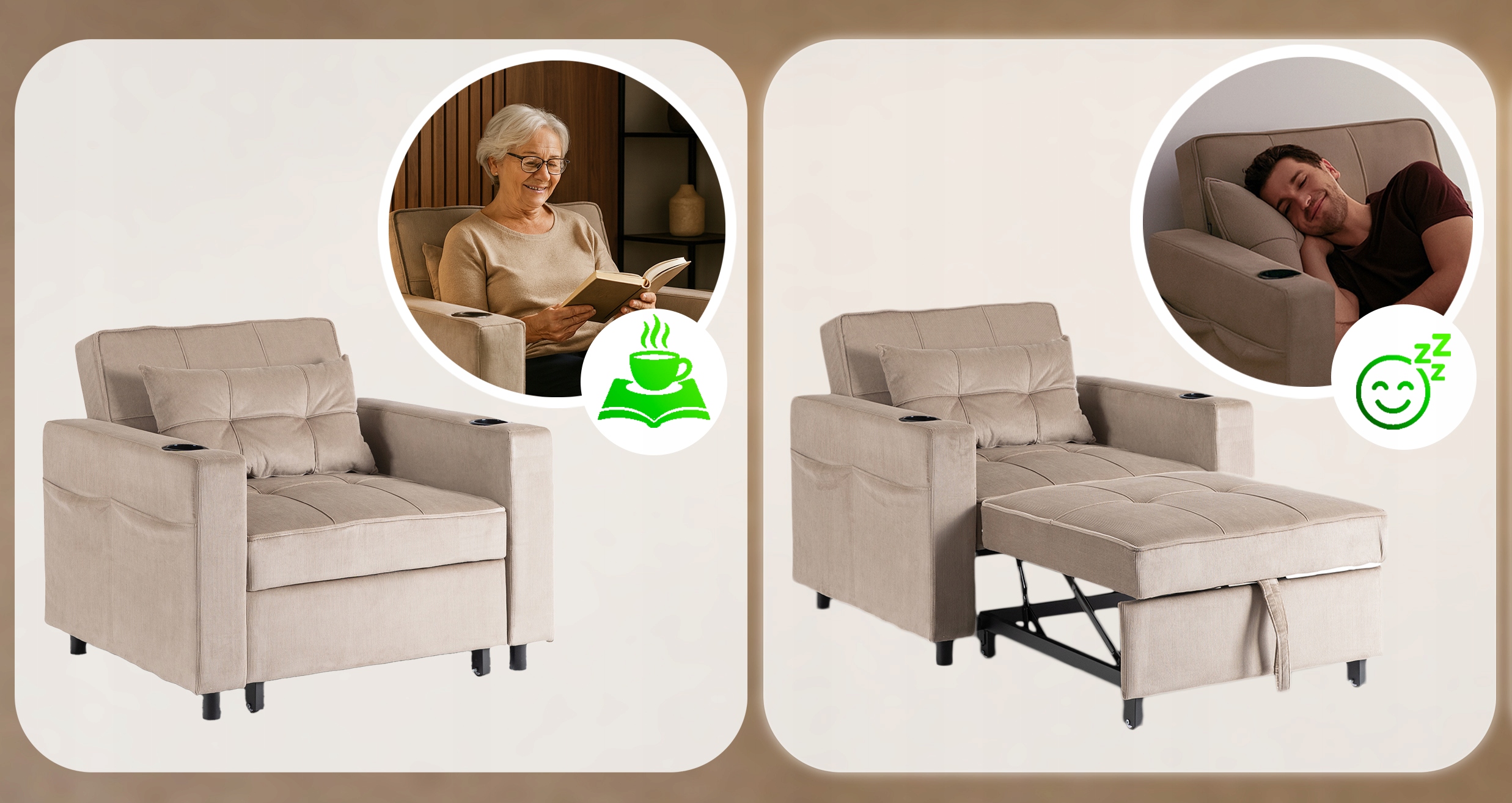 - W kawalerce lub małym mieszkaniu – oszczędza przestrzeń, łącząc trzy funkcje w jednym: fotel, leżankę i łóżko.