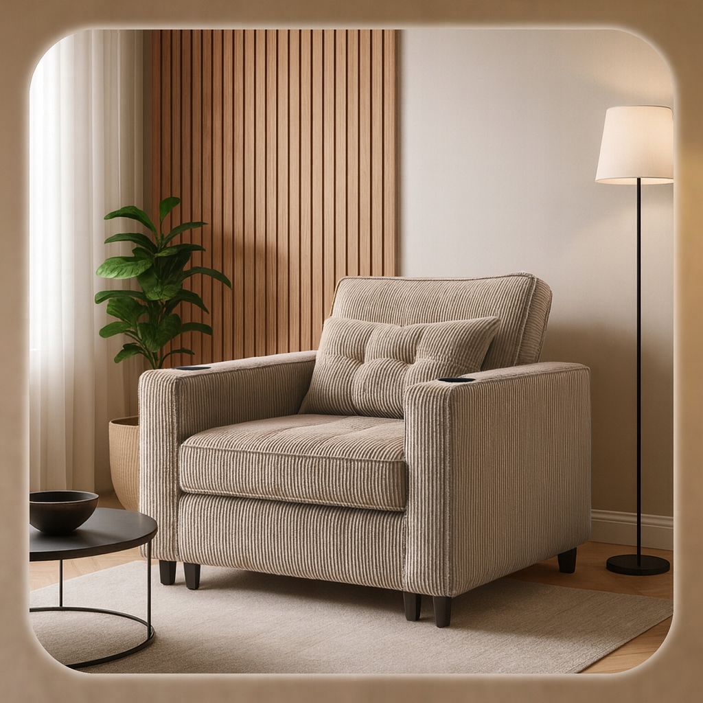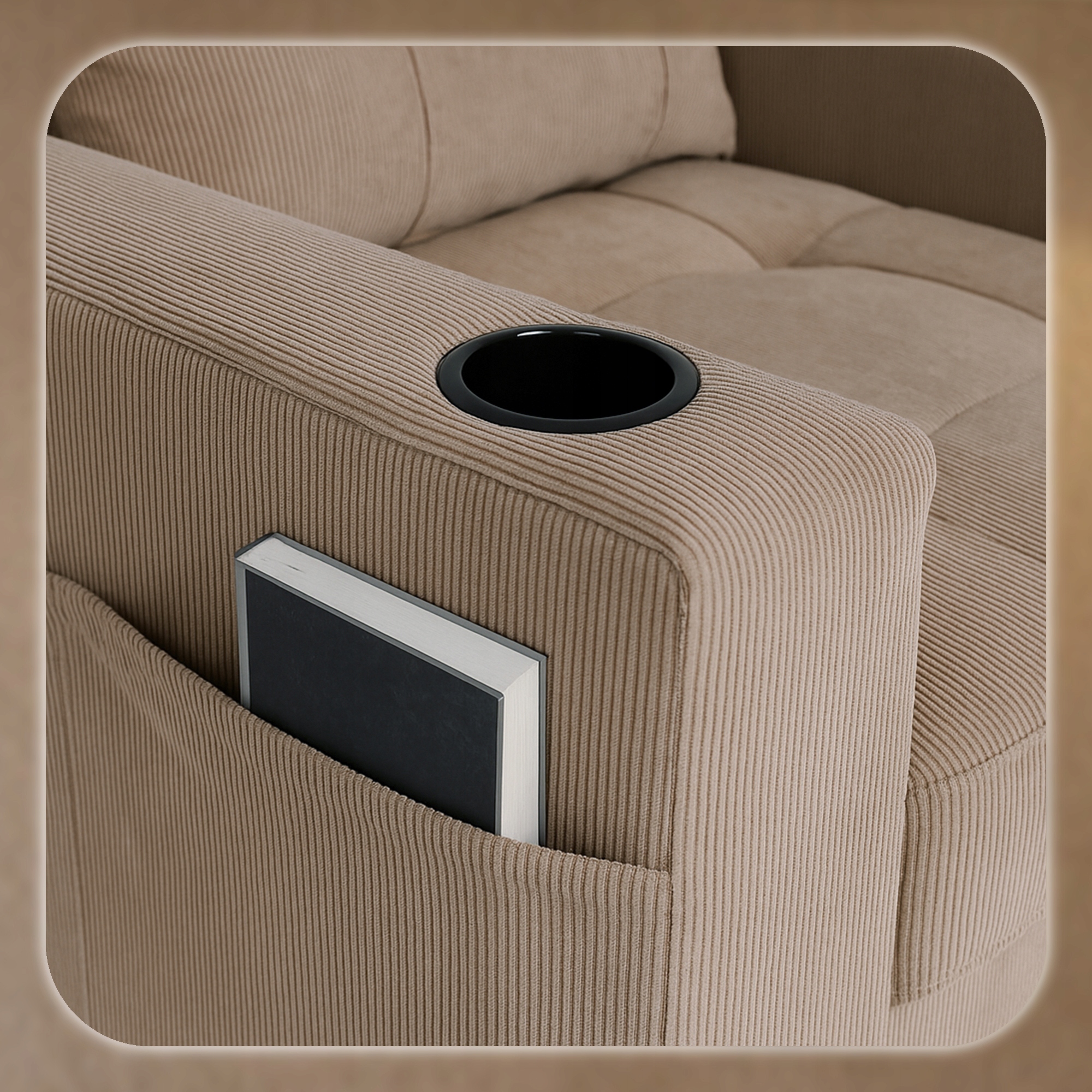 Praktyczny uchwyt na kubek pozwala bezpiecznie odstawić napój w zasięgu ręki, bez ryzyka rozlania. Boczna kieszeń to wygodne miejsce na książkę, gazetę czy tablet – wszystko, co potrzebne do relaksu, zawsze masz pod ręką.