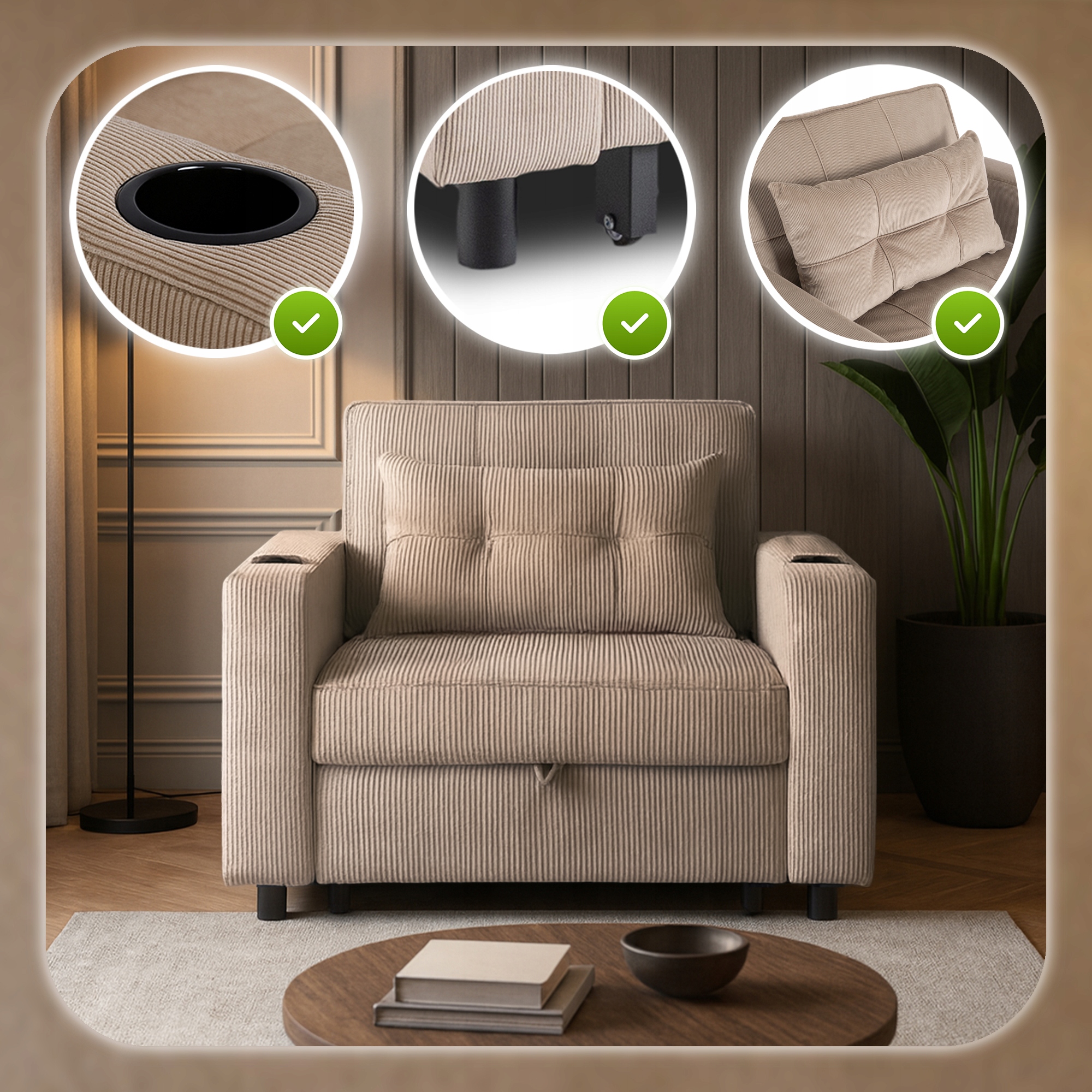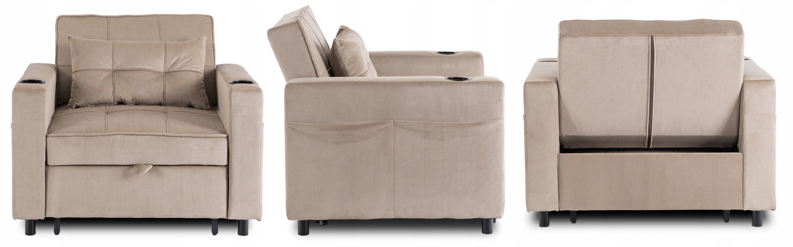 Fotel SOLOR w kolorze beżowym to doskonałe połączenie komfortu i praktyczności. W kilka chwil zmienia się z klasycznego fotela w leżankę lub wygodne łóżko, oferując trzy poziomy rozłożenia, które idealnie dopasujesz do swoich potrzeb – od popołudniowego relaksu, przez seans filmowy, aż po nocny odpoczynek.