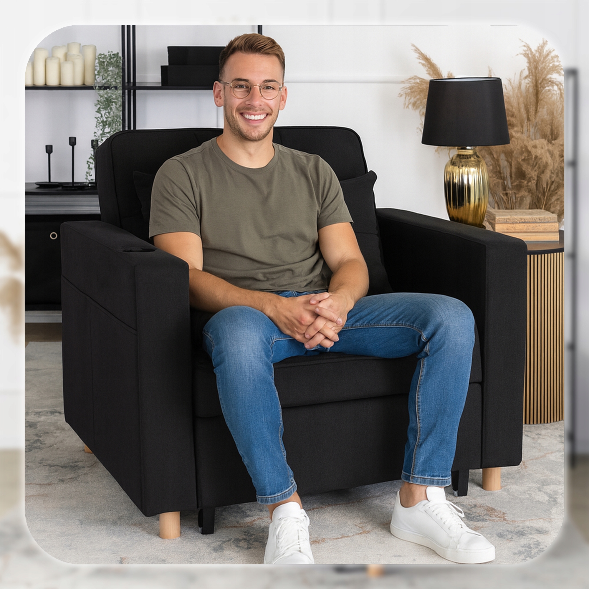 Fotel SOLOR w kolorze czarnym to doskonałe połączenie komfortu i praktyczności. W kilka chwil zmienia się z klasycznego fotela w leżankę lub wygodne łóżko, oferując trzy poziomy rozłożenia, które idealnie dopasujesz do swoich potrzeb – od popołudniowego relaksu, przez seans filmowy, aż po nocny odpoczynek.