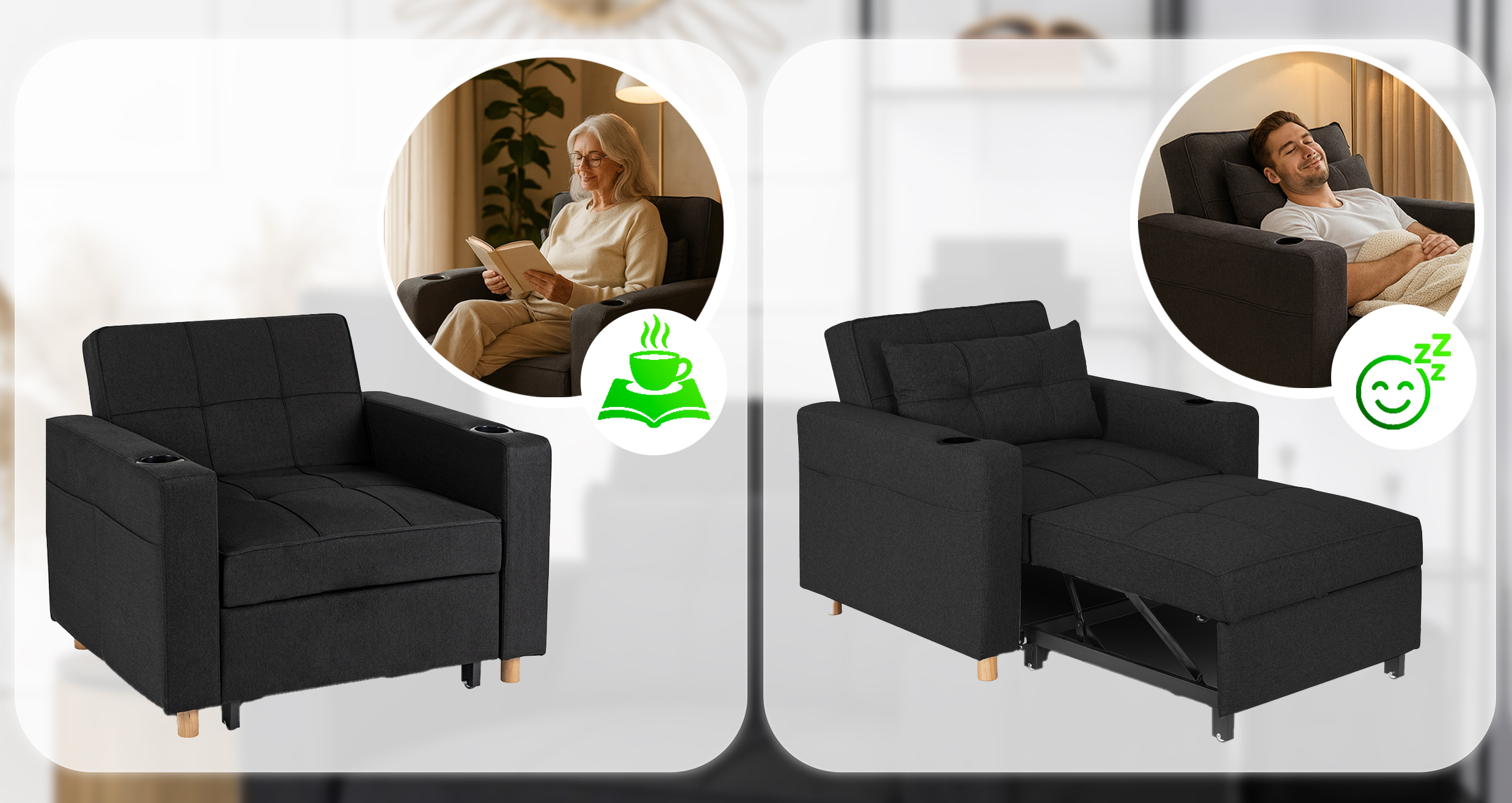 - W kawalerce lub małym mieszkaniu – oszczędza przestrzeń, łącząc trzy funkcje w jednym: fotel, leżankę i łóżko.