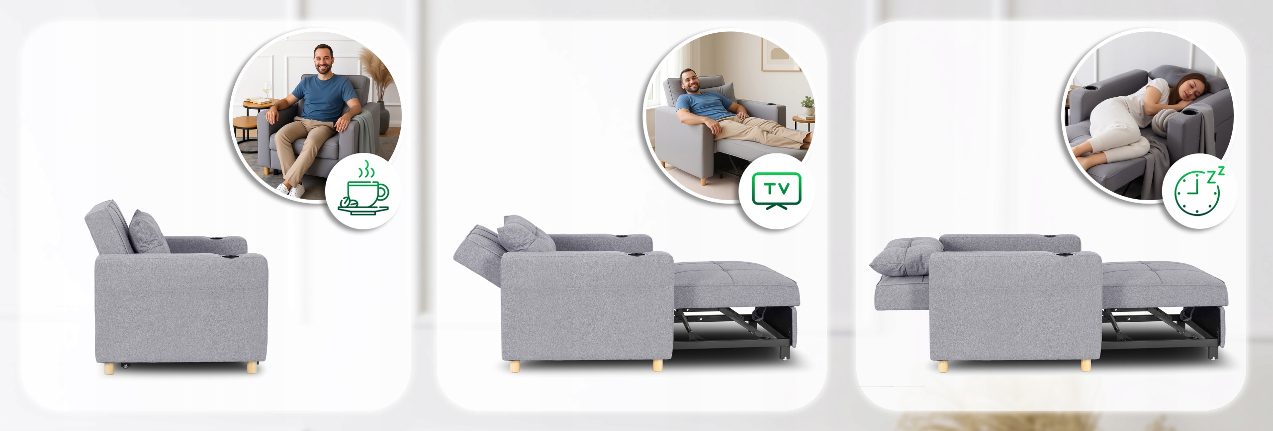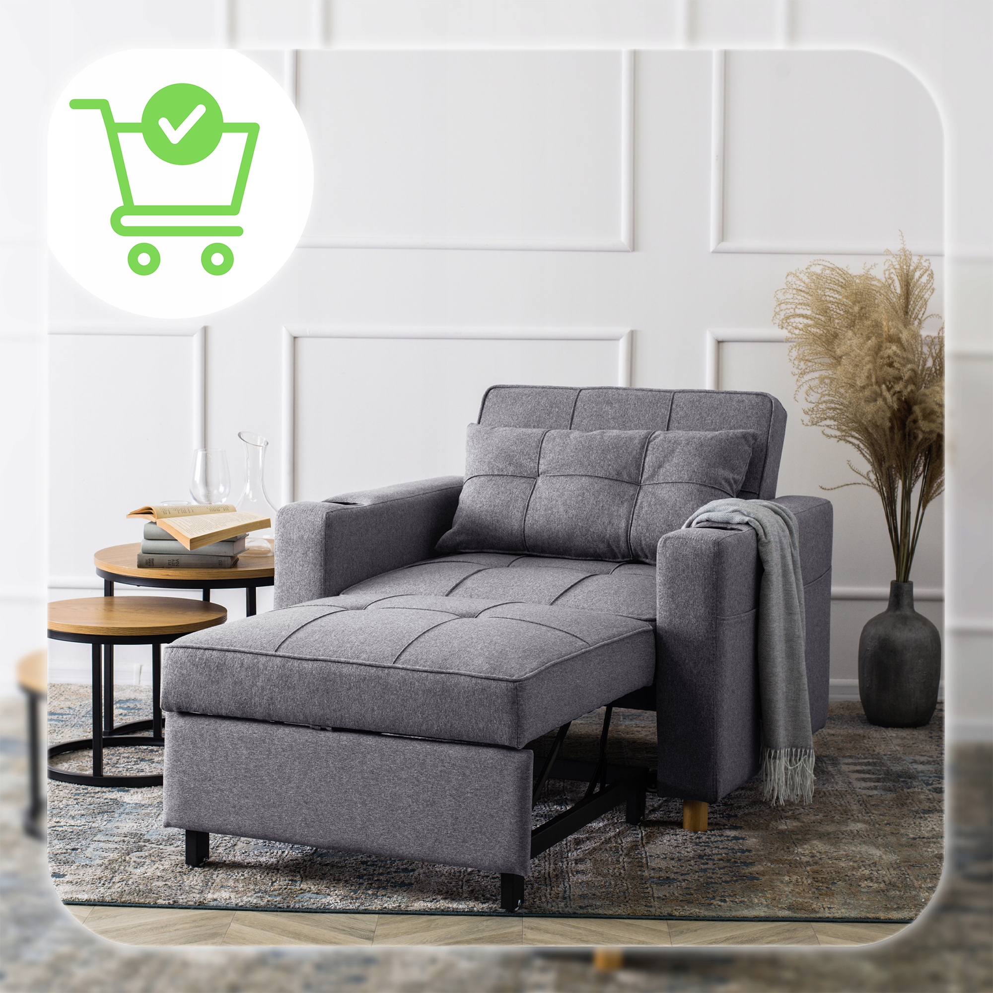 - W kawalerce lub małym mieszkaniu – oszczędza przestrzeń, łącząc trzy funkcje w jednym: fotel, leżankę i łóżko.