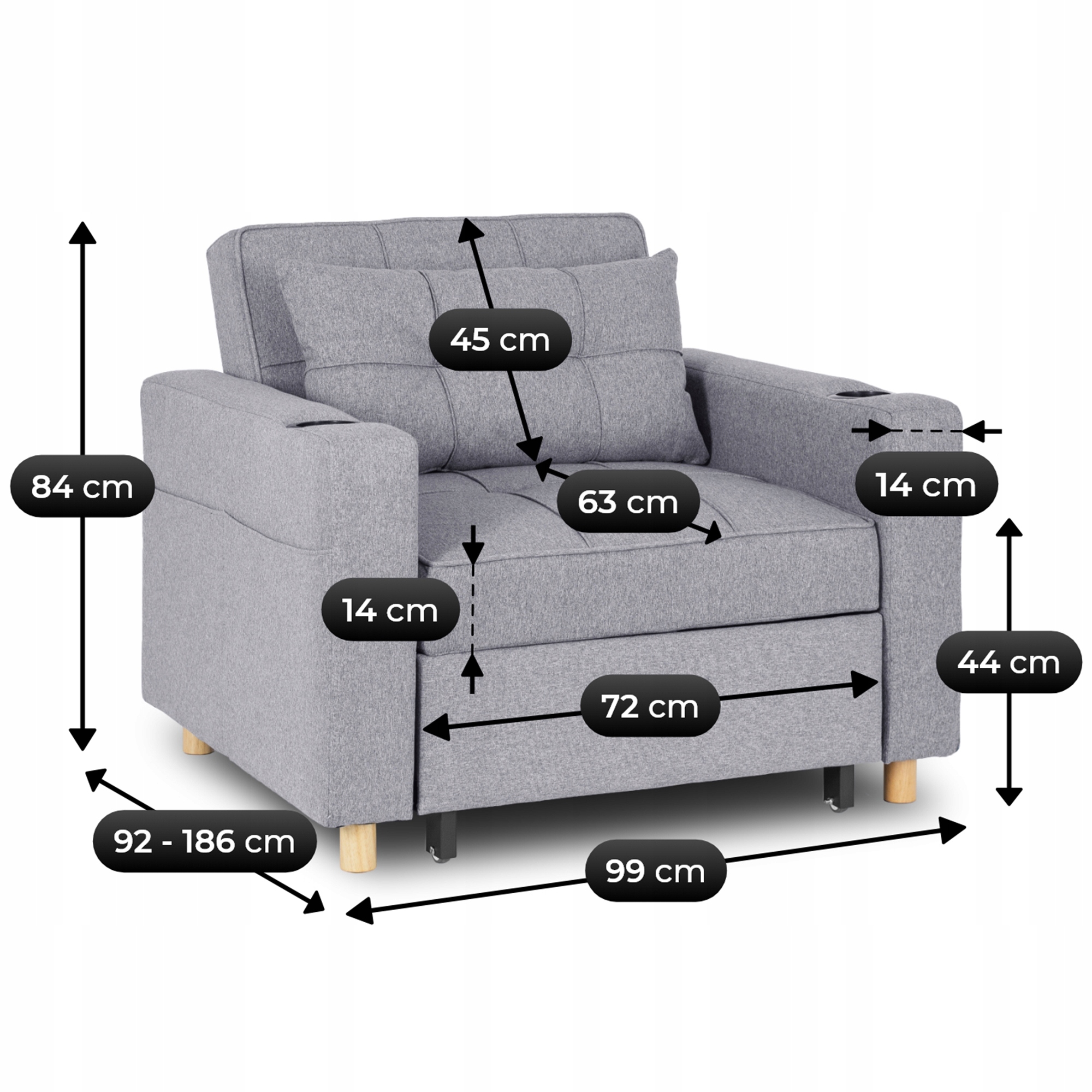 - Głębokość fotela: 92 - 186 cm