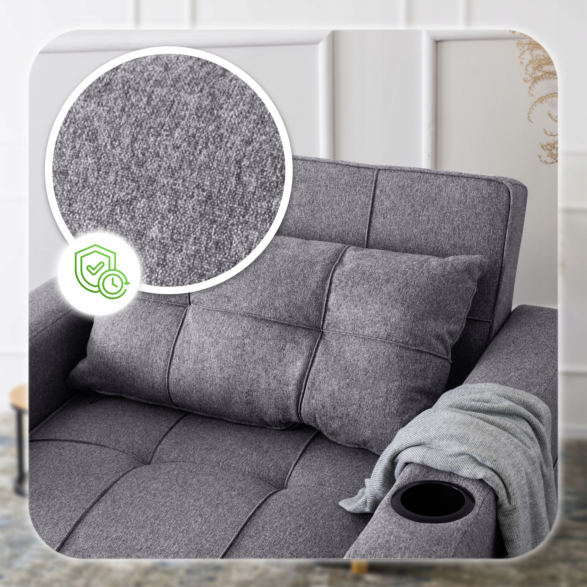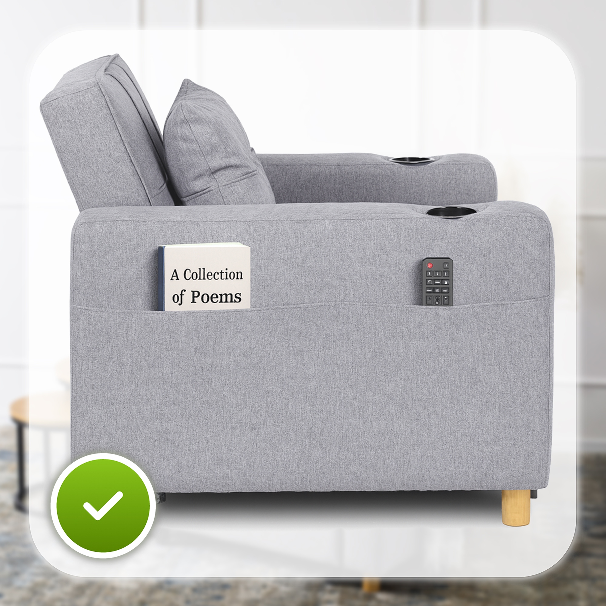 - Miejsca na napój – praktyczne uchwyty w podłokietnikach mieszczą butelkę, szklankę czy puszkę, zapewniając wygodę podczas odpoczynku.