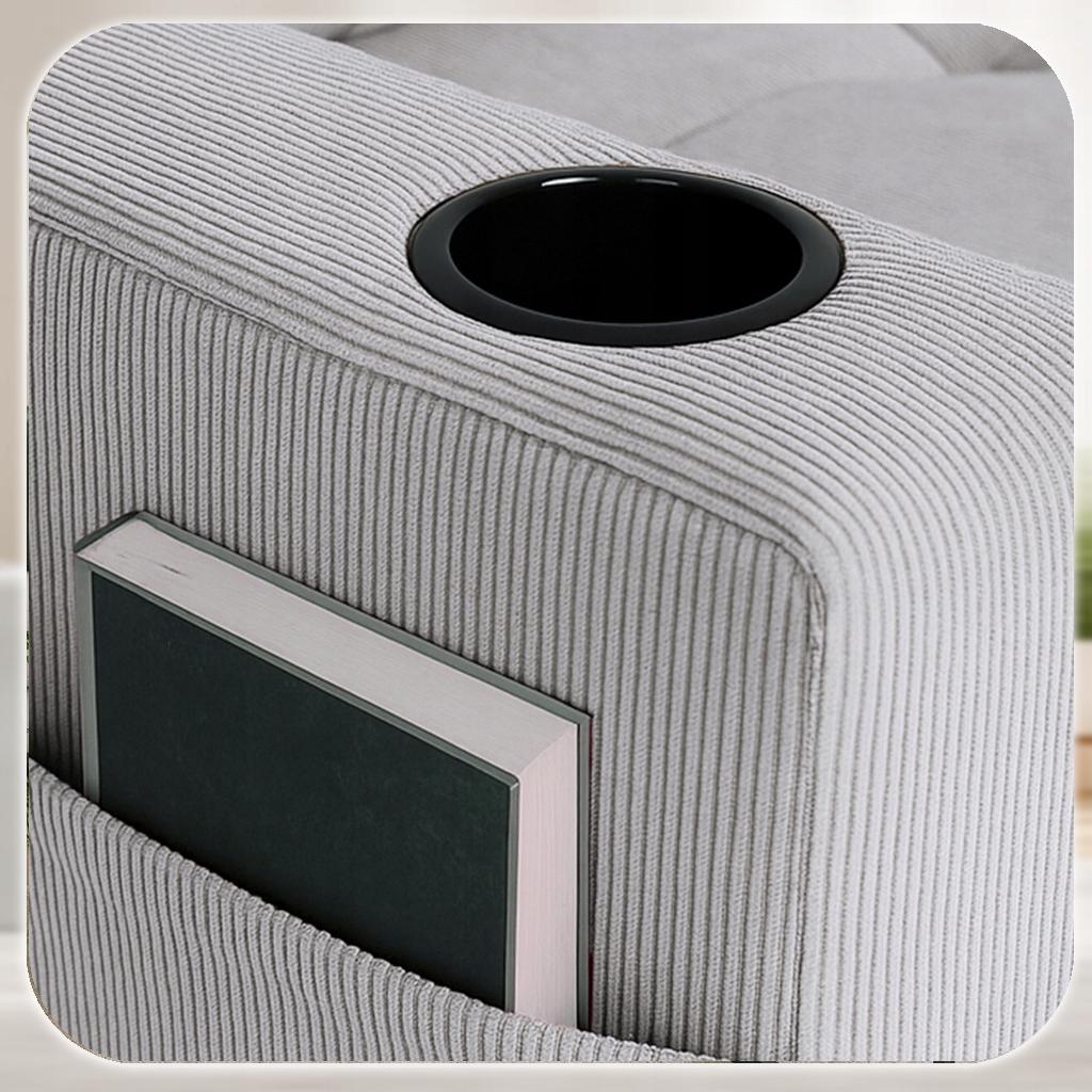 - Praktyczne kieszonki boczne oraz uchwyty na napoje – doskonałe miejsce na książkę, pilota czy napój, zawsze pod ręką.