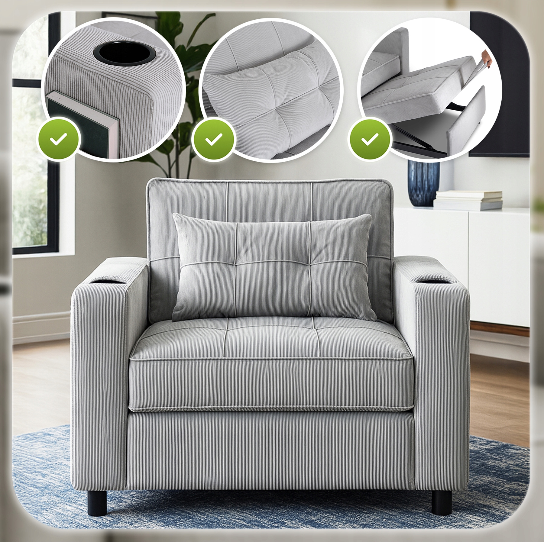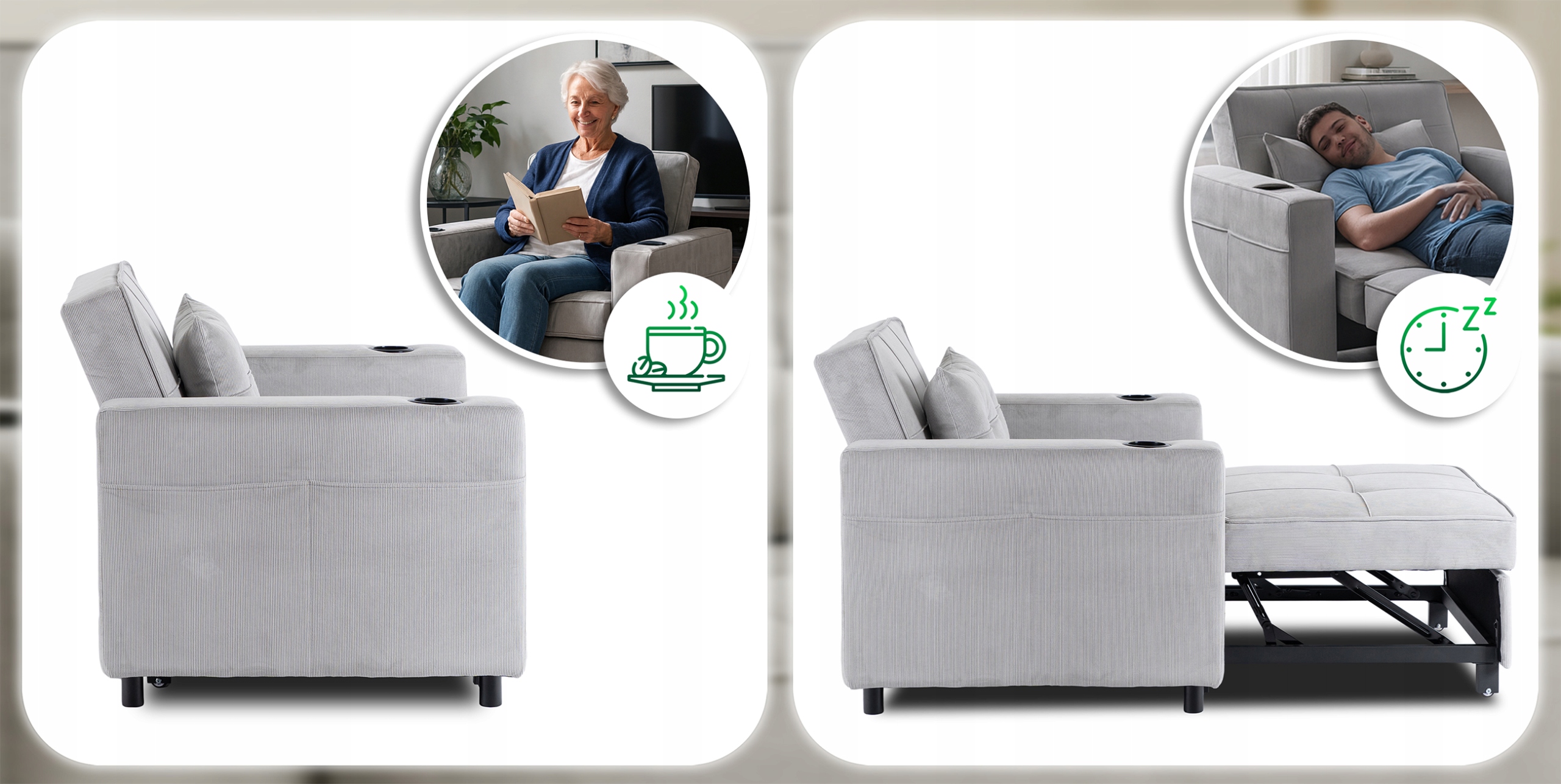 Praktyczne uchwyty na kubek pozwalają bezpiecznie odstawić napój w zasięgu ręki, bez ryzyka rozlania. Boczne kieszenie to wygodne miejsce na książkę, gazetę czy tablet – wszystko, co potrzebne do relaksu, zawsze masz pod ręką.