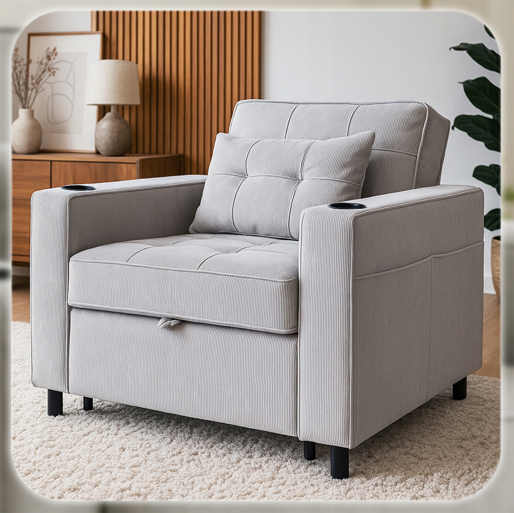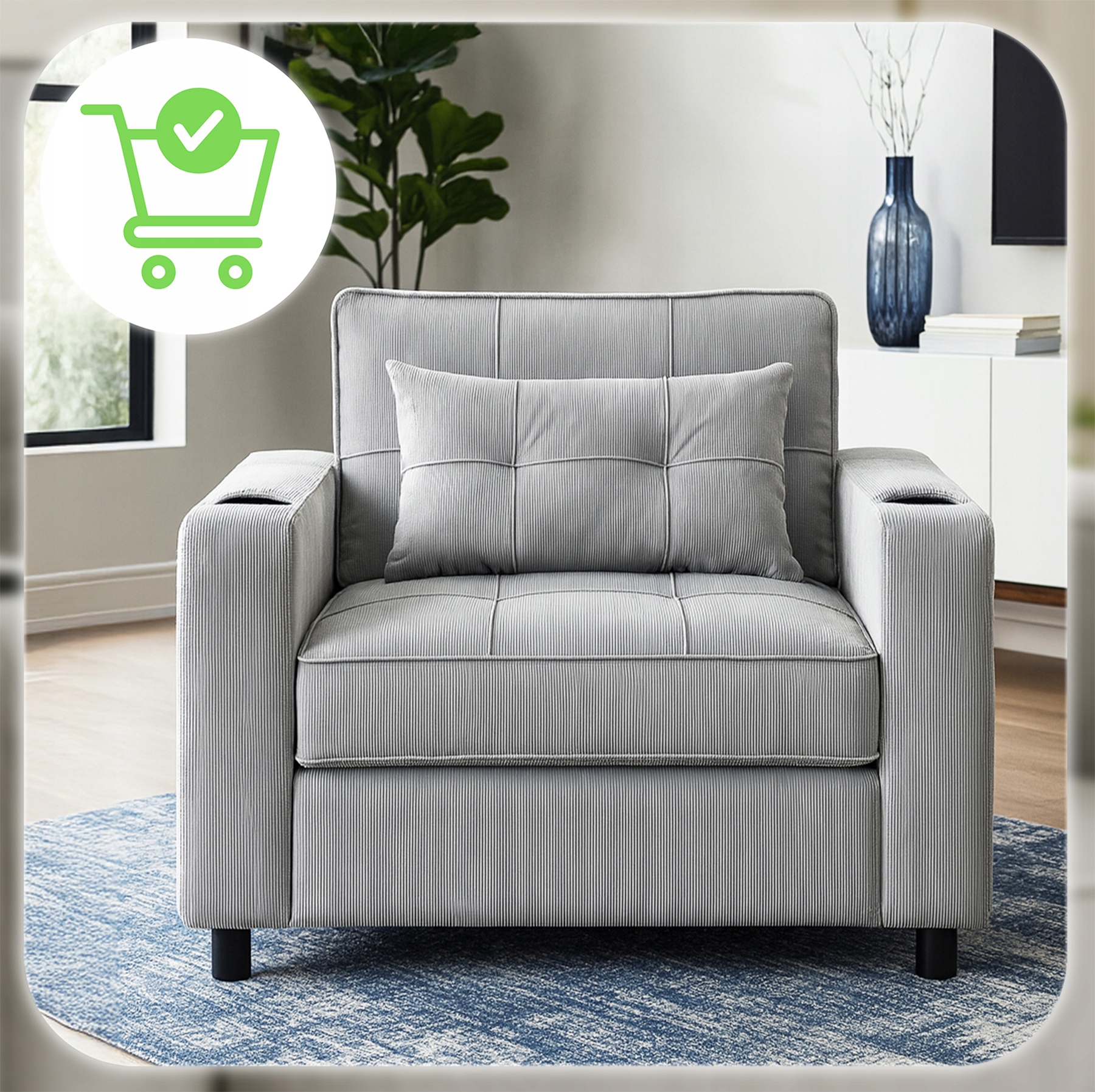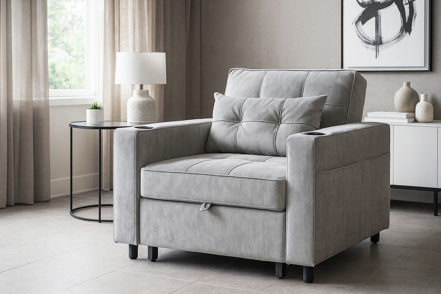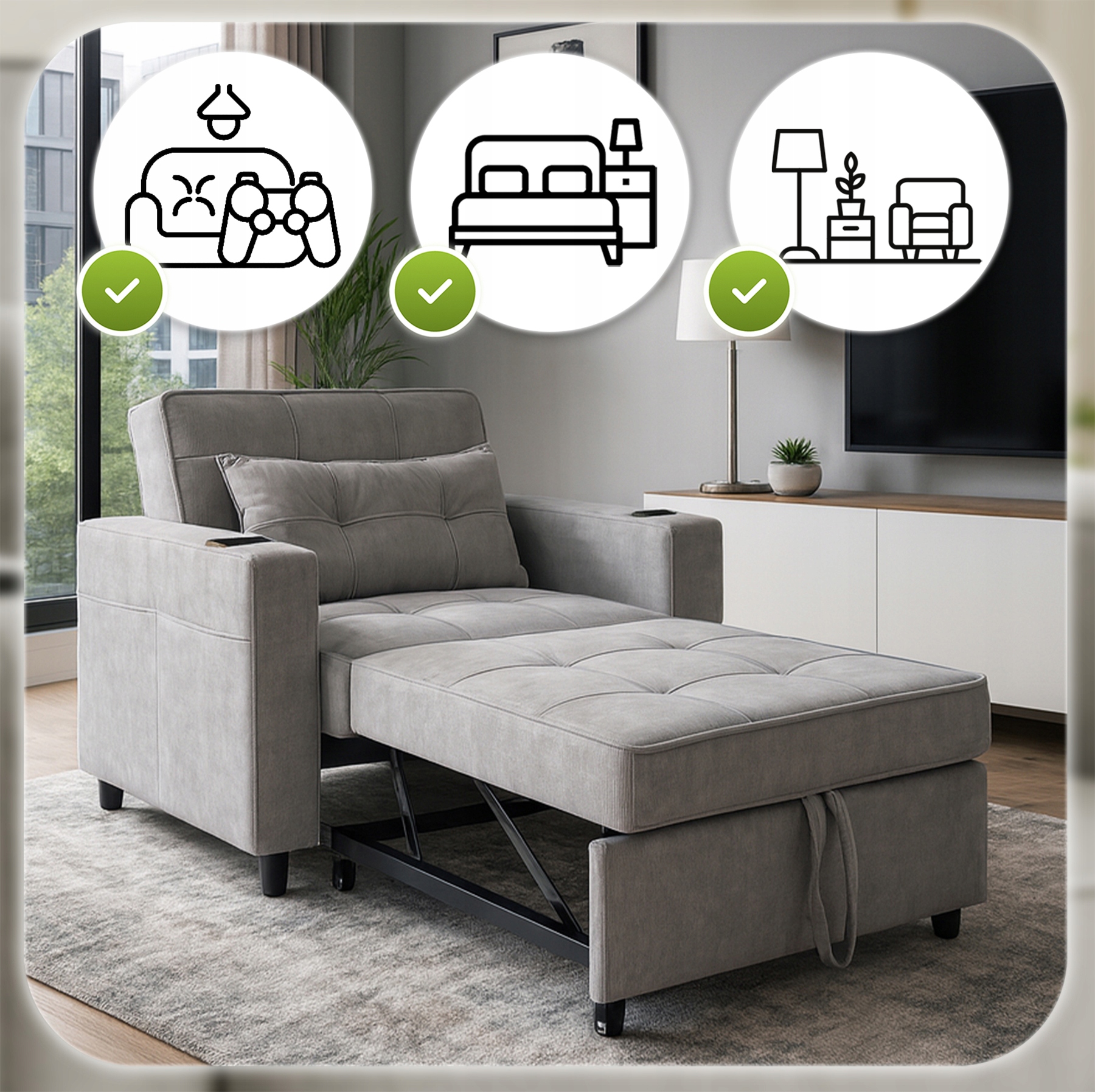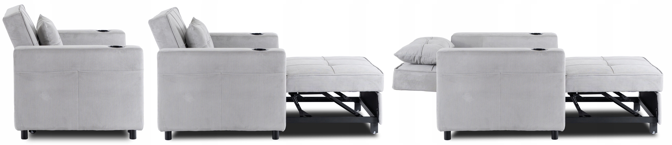 Ten fotel rozkładany łączy elegancję z funkcjonalnością – w kilka chwil zmienia się w wygodne łóżko. Świetnie sprawdzi się w salonie, sypialni, pokoju gościnnym, a także w hotelach.
