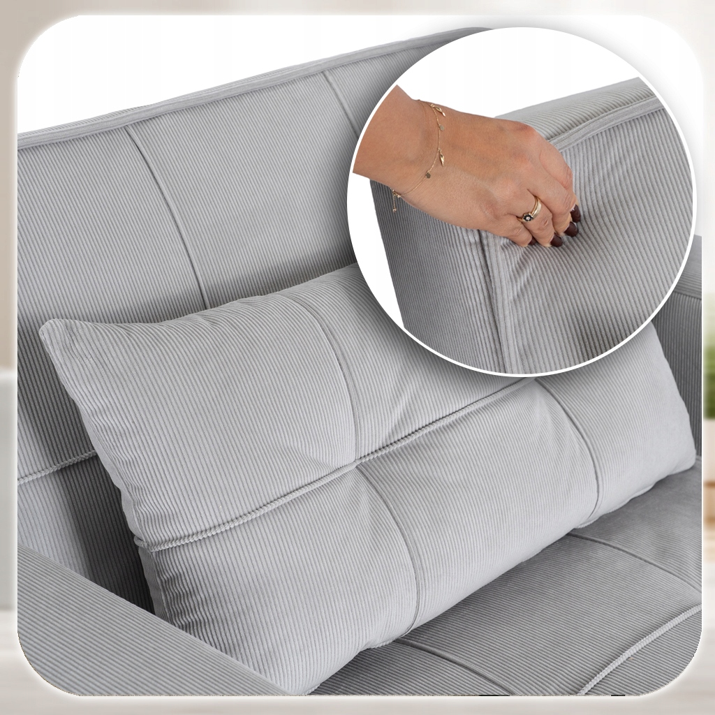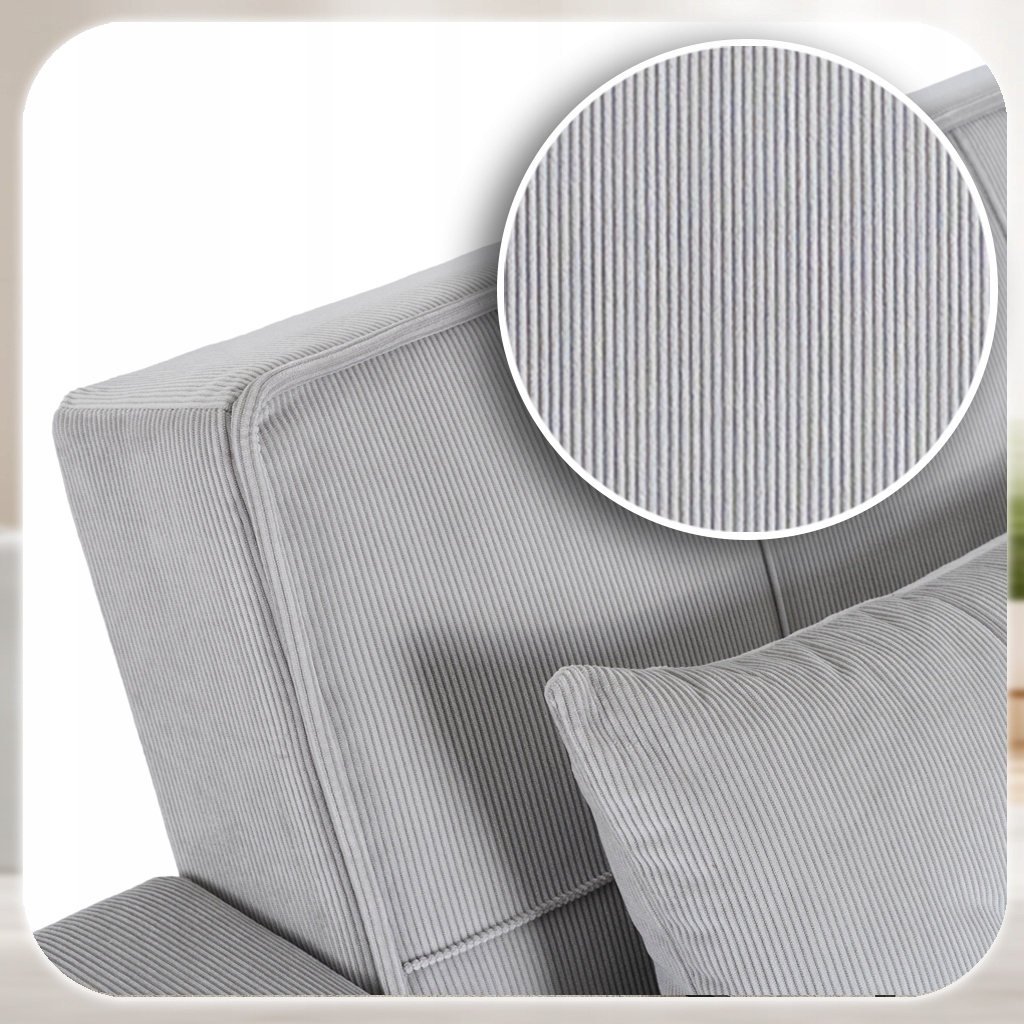 - Sztruksowa elegancja – trwała i wytrzymała tkanina, odporna na codzienne użytkowanie. Miękka i przyjemna w dotyku.