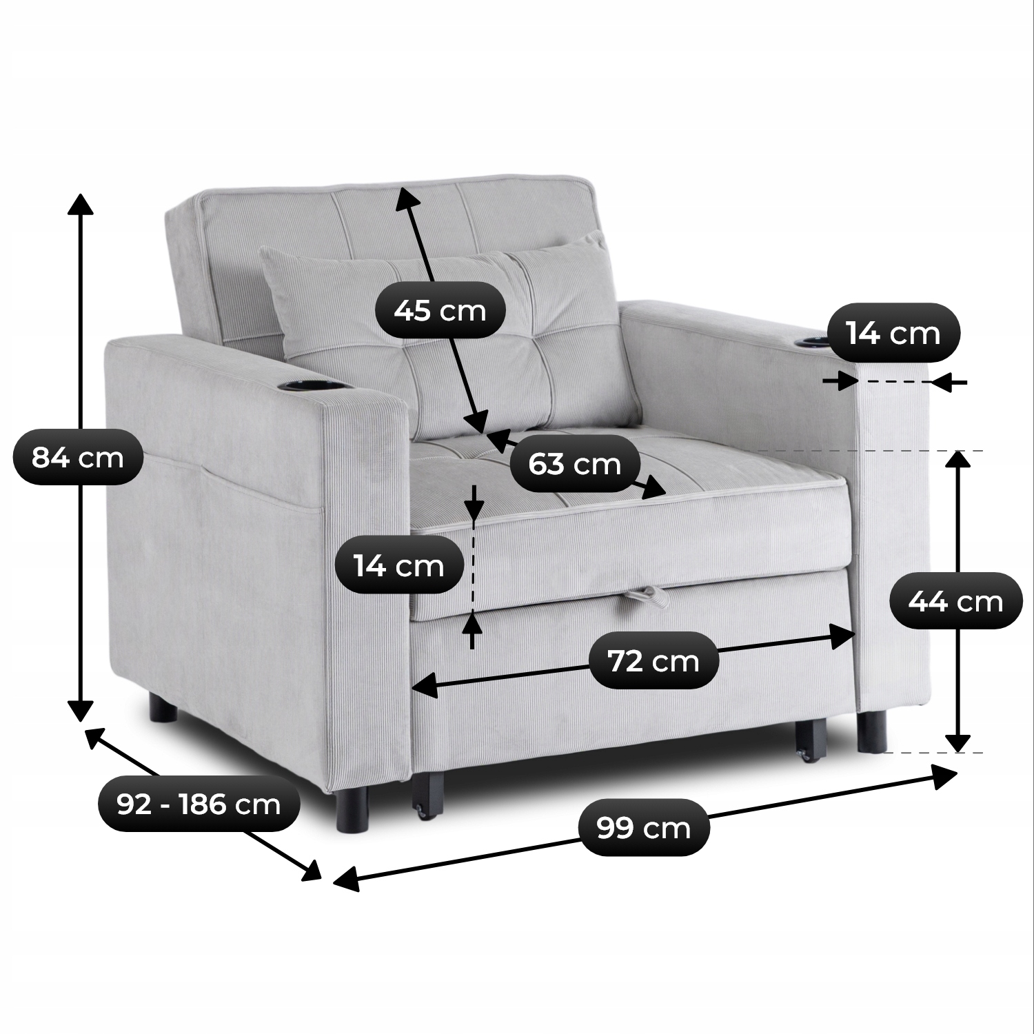 - Głębokość fotela: 92 - 186 cm