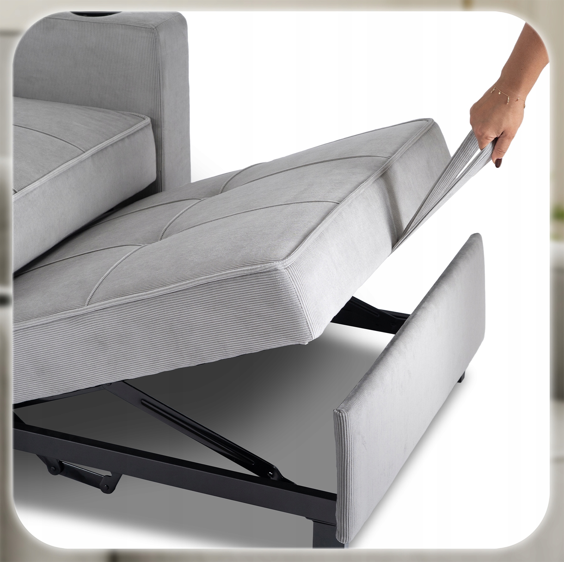 - Popołudniową drzemkę – szybka zmiana w praktyczne łóżko daje Ci miejsce na regenerację bez potrzeby rozkładania dodatkowego mebla.
