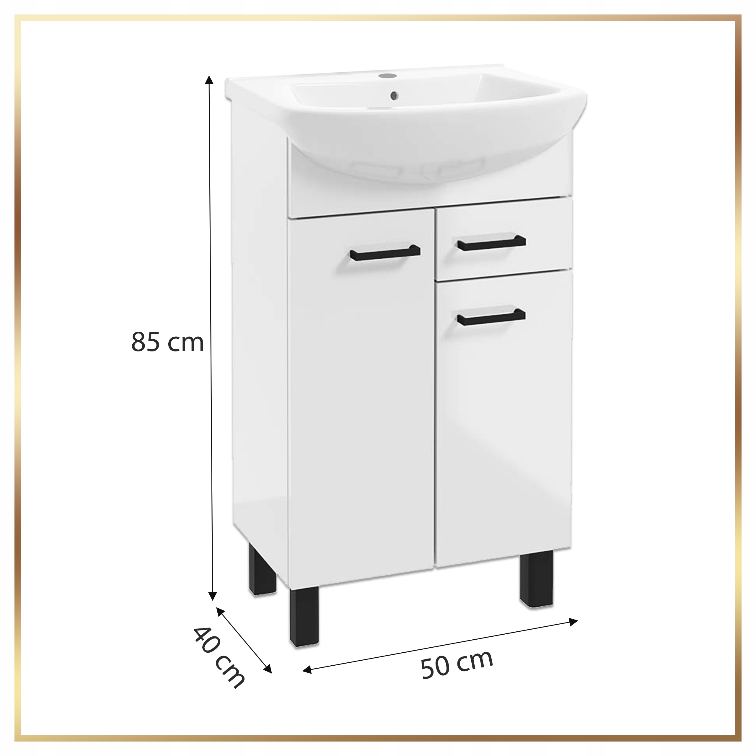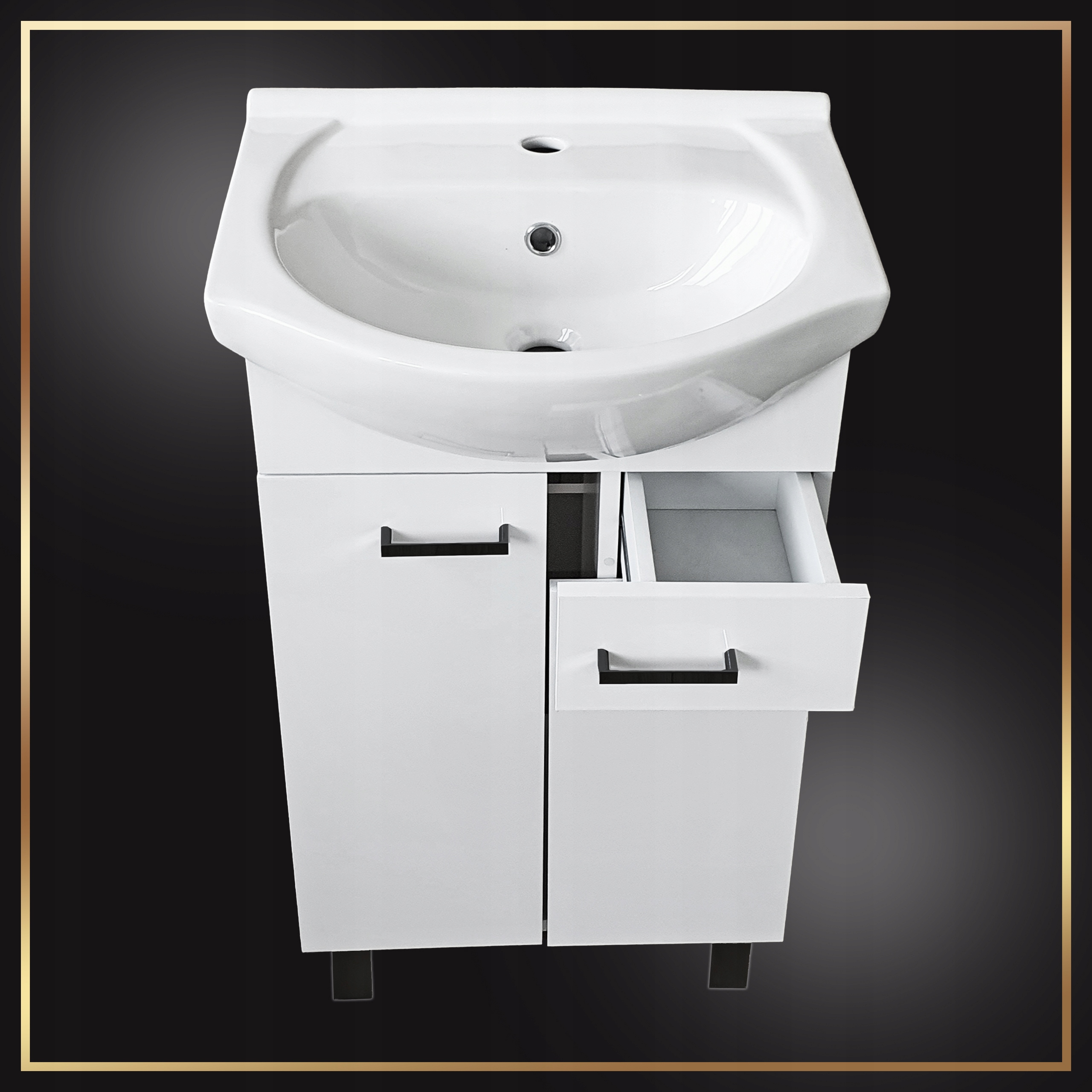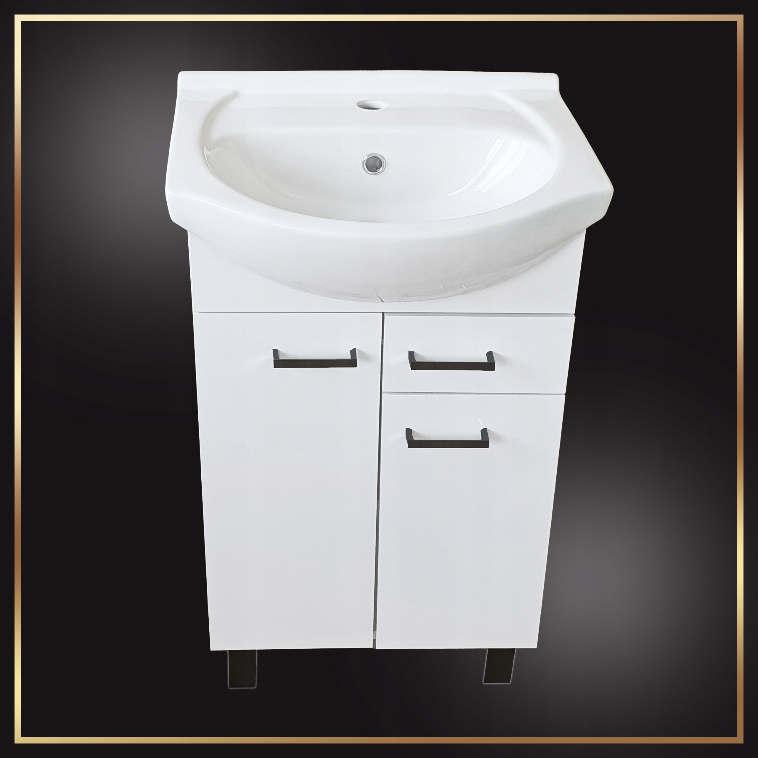 Biała Szafka Stojąca z Umywalką do Łazienki 50 Lakier Czarna Bateria Obrotowa
