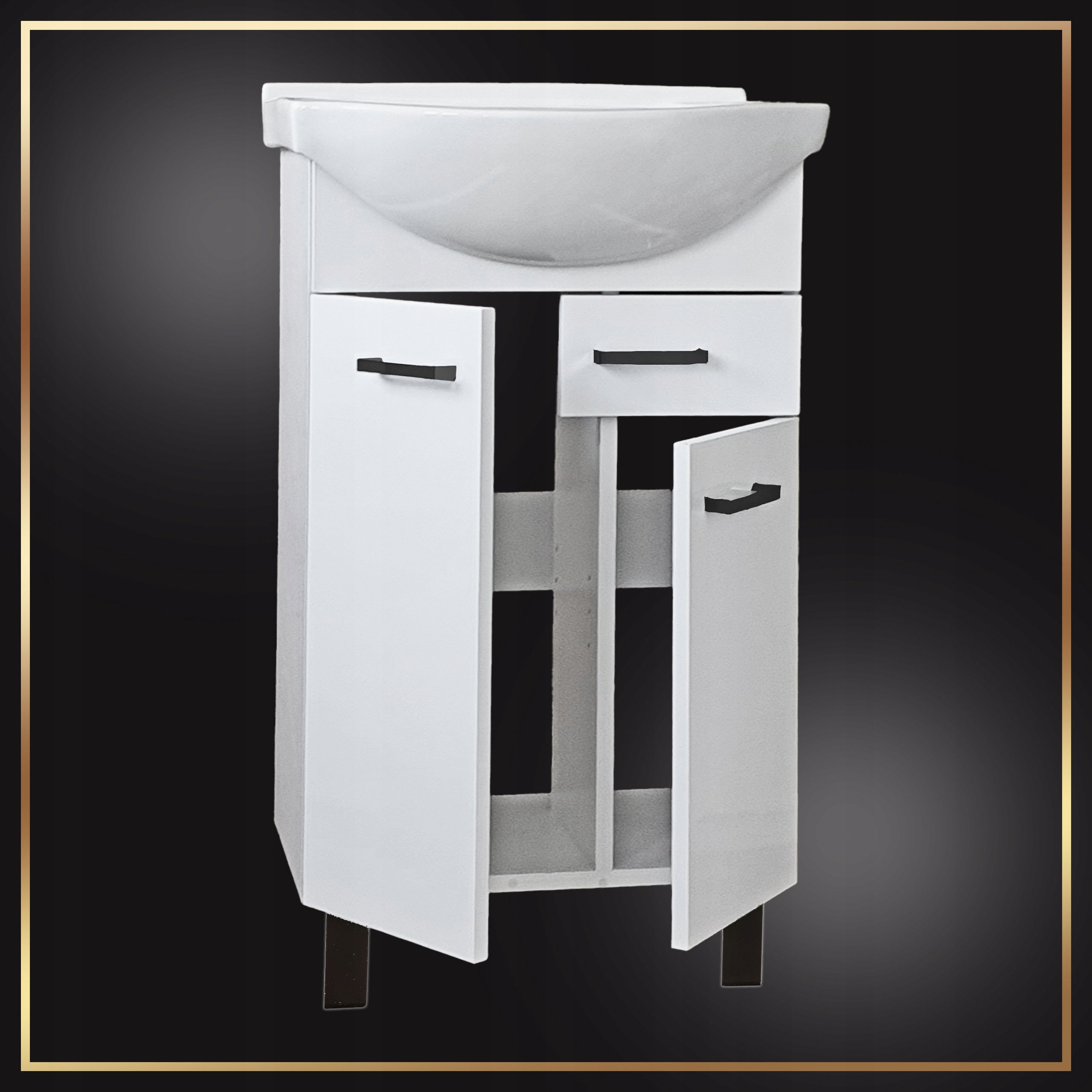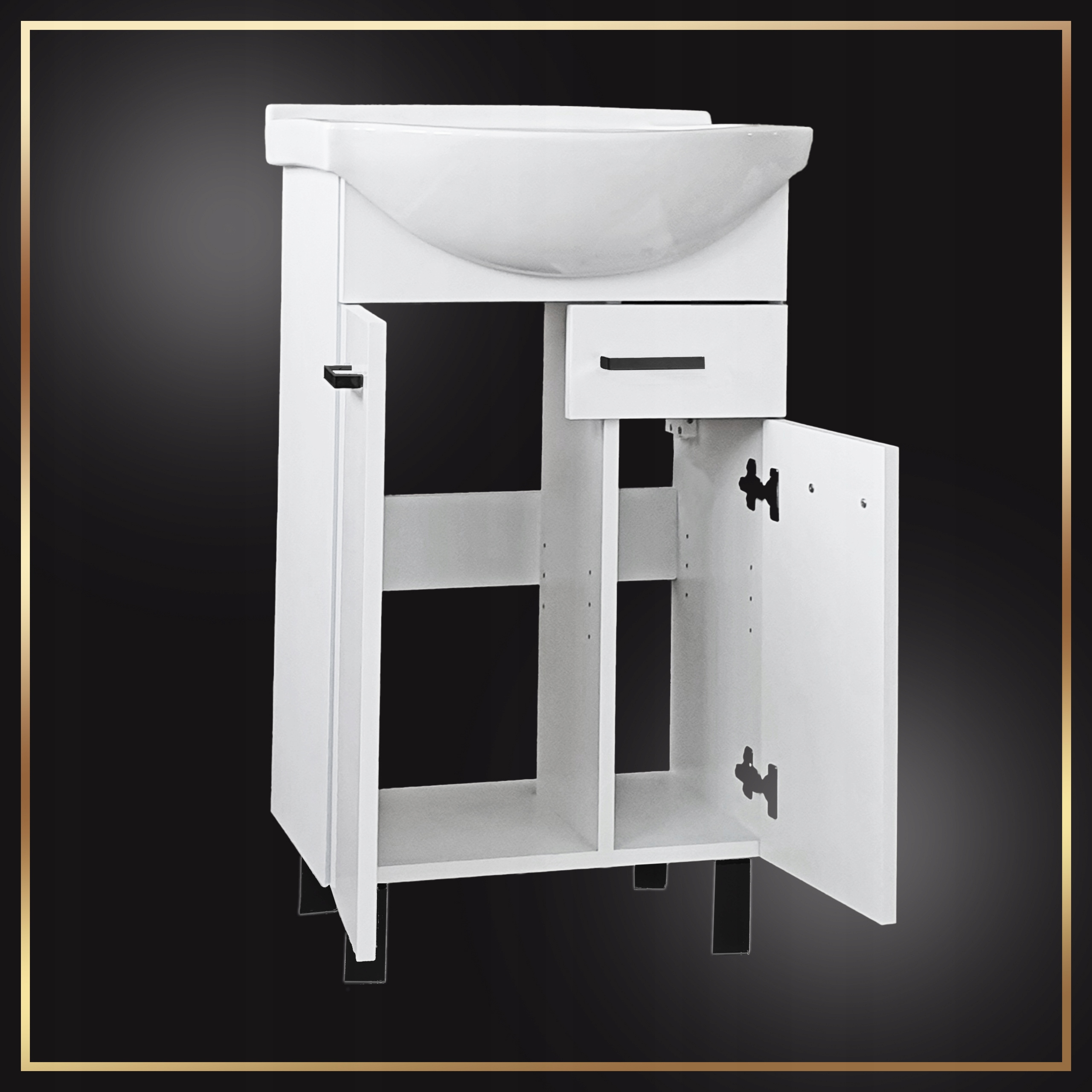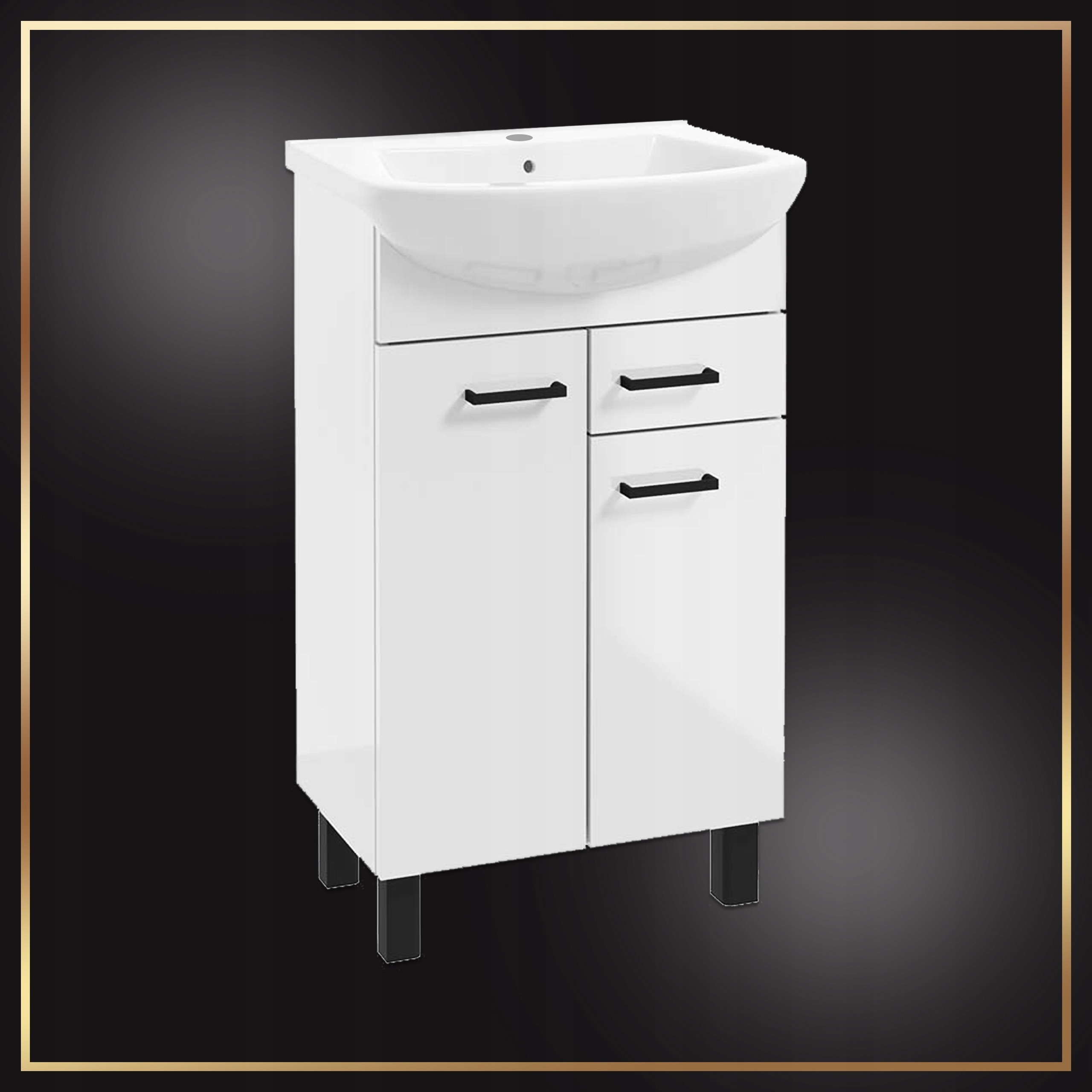 Biała Szafka Stojąca z Umywalką do Łazienki 50 Lakier Czarna Bateria Obrotowa