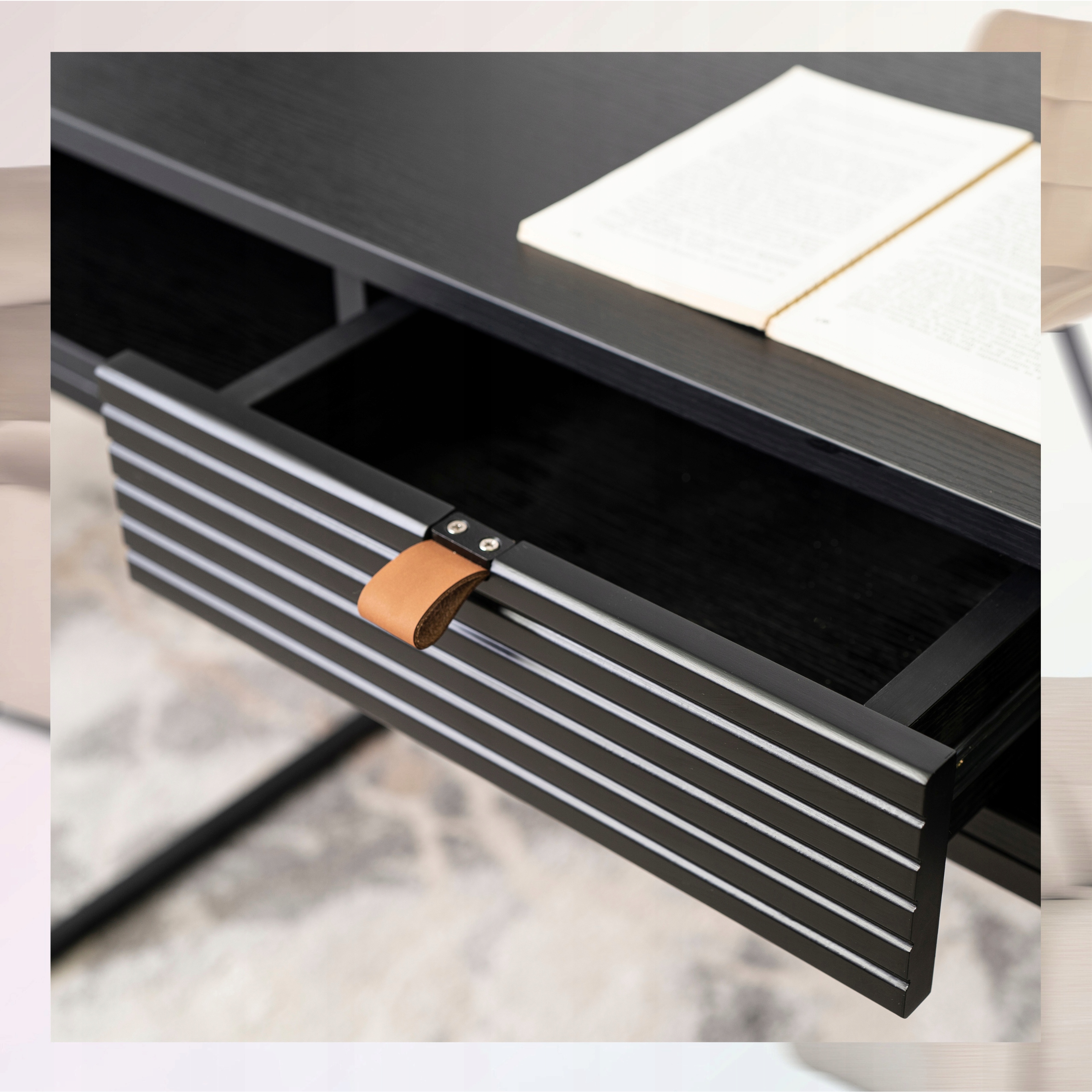 ⭐ Do dyspozycji są dwie otwarte półki oraz umiejscowiona pośrodku szuflada z pięknym czarnym ryflowanym frontem.