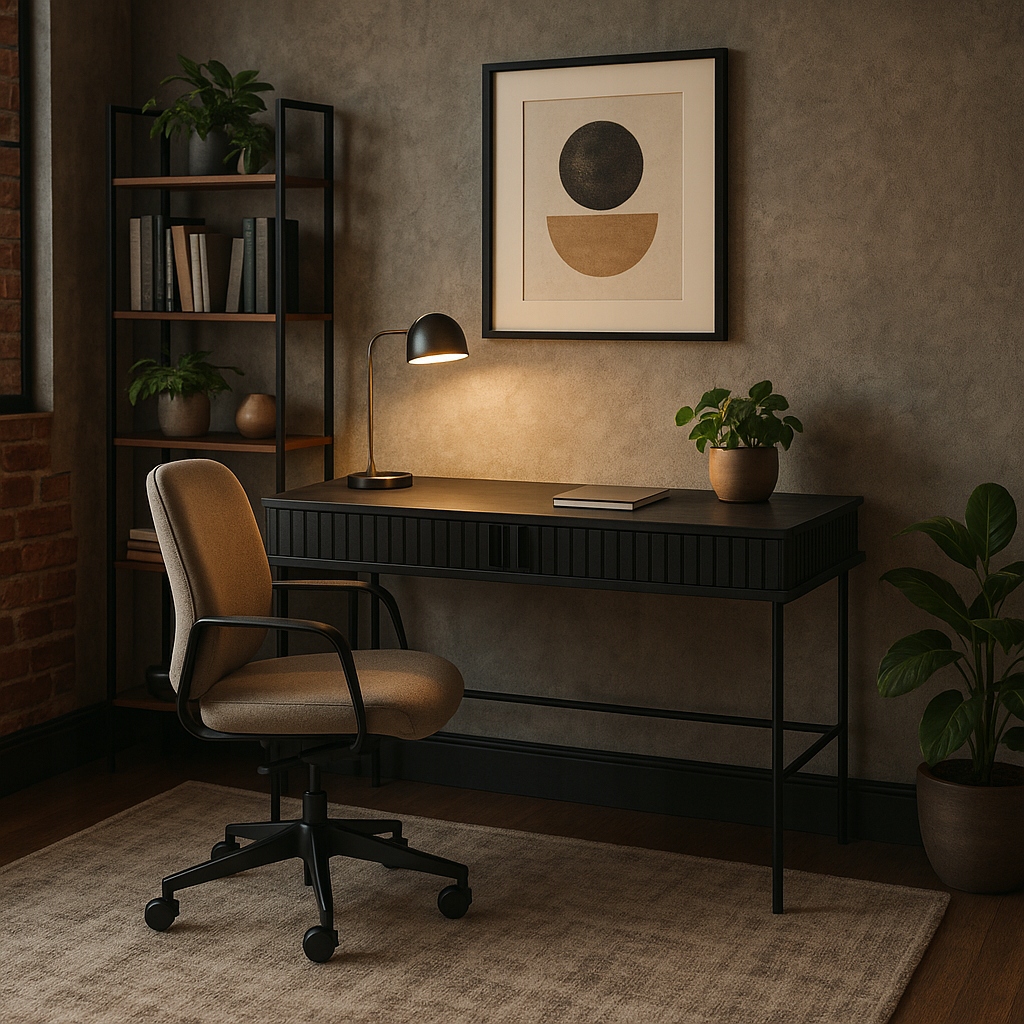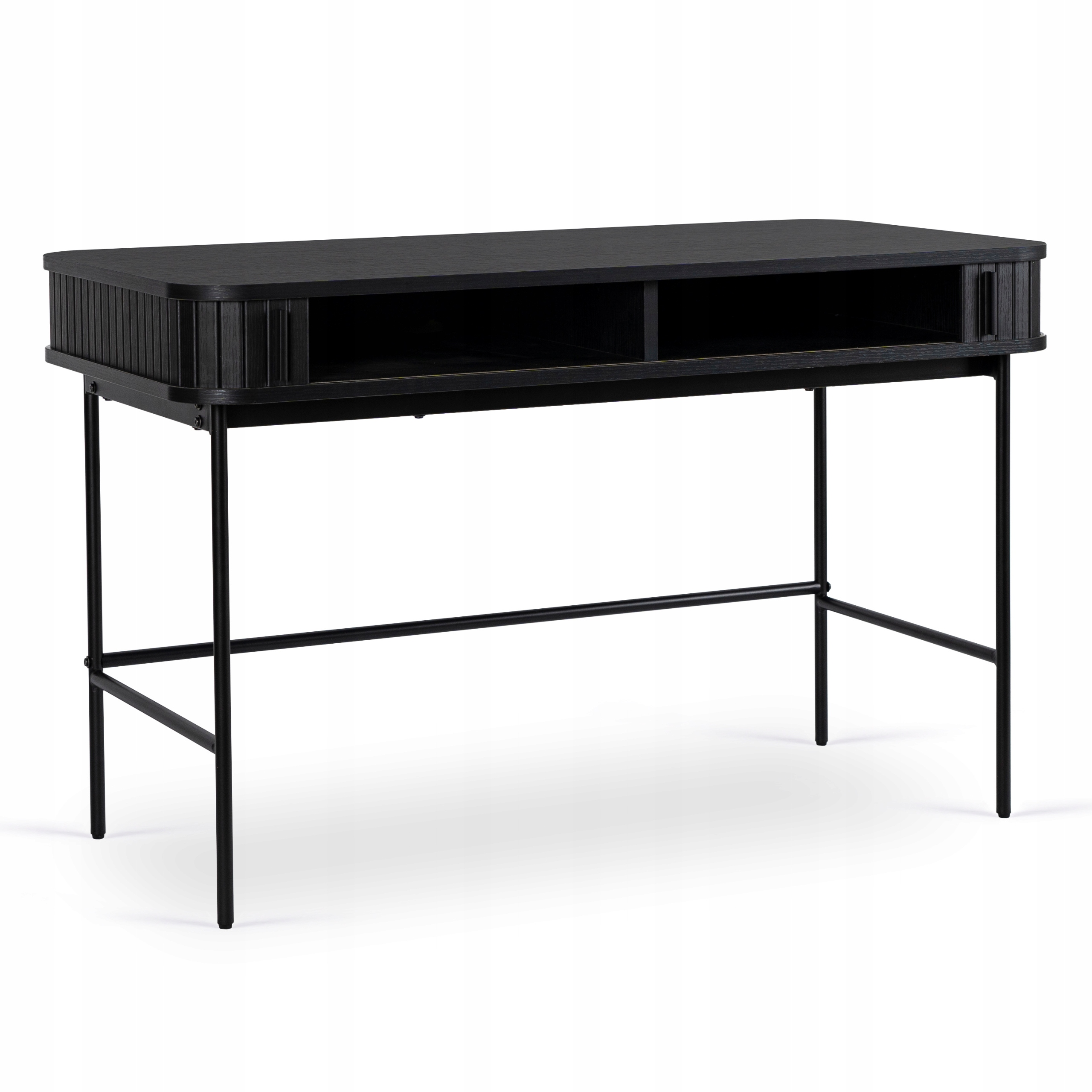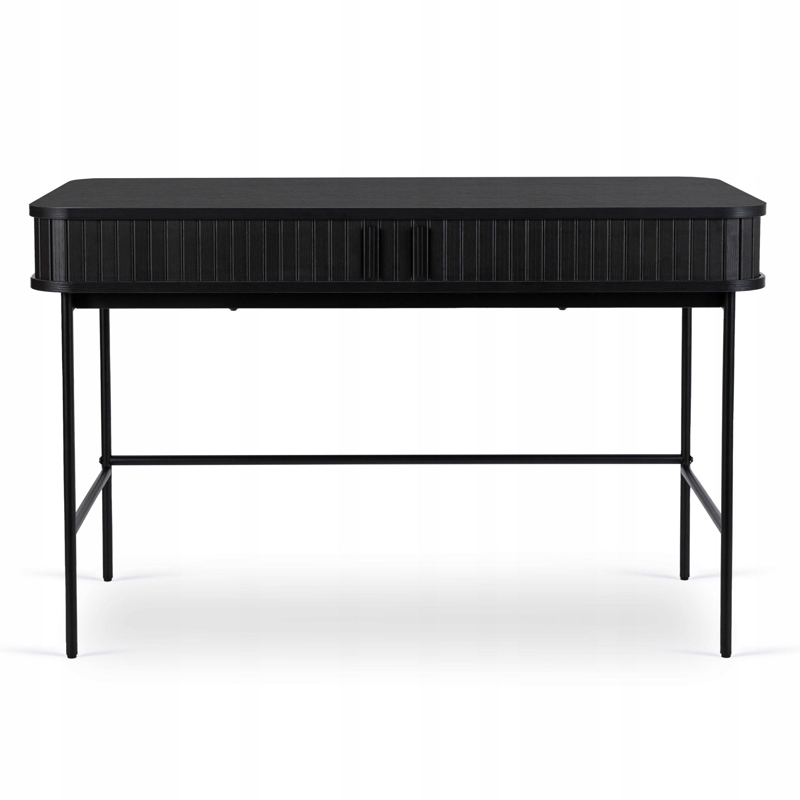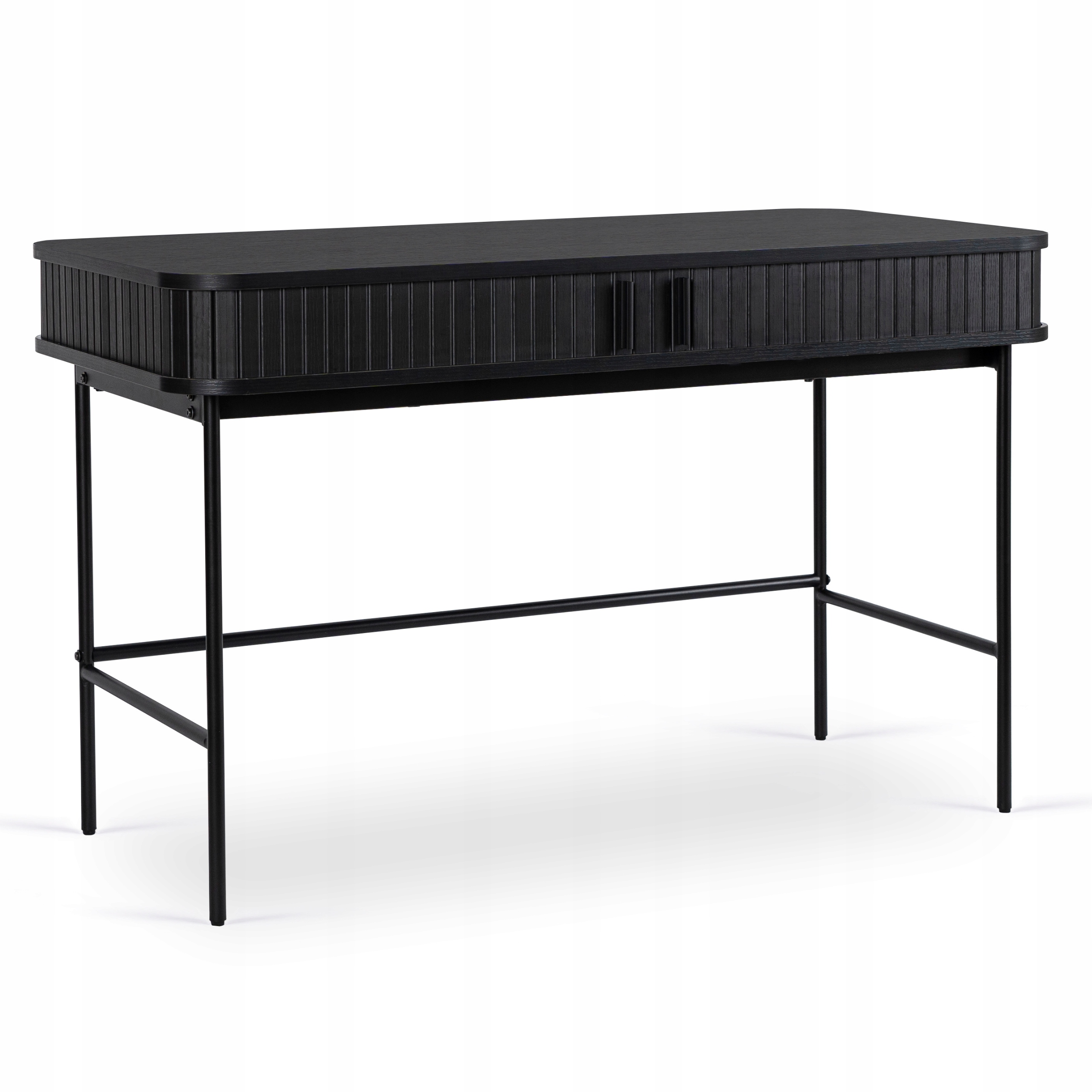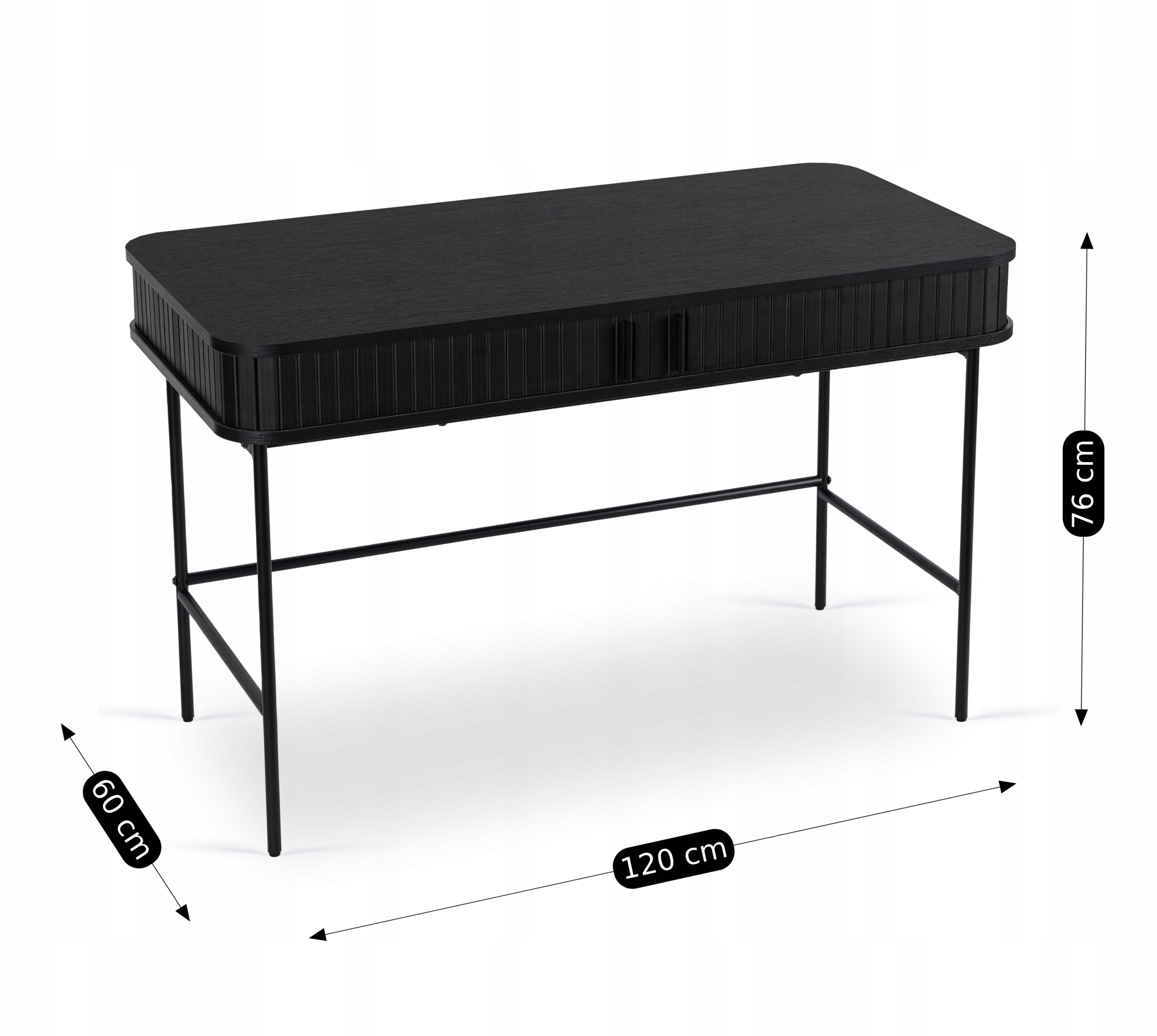 Biurko o wymiarach 120 x 60 x 76 cm to nowoczesny i praktyczny mebel idealny do gabinetu, biura, pokoju lub recepcji. Jego design podkreślają stylowe lamele, a loftowego charakteru nadają metalowe czarne nogi i uchwyty.