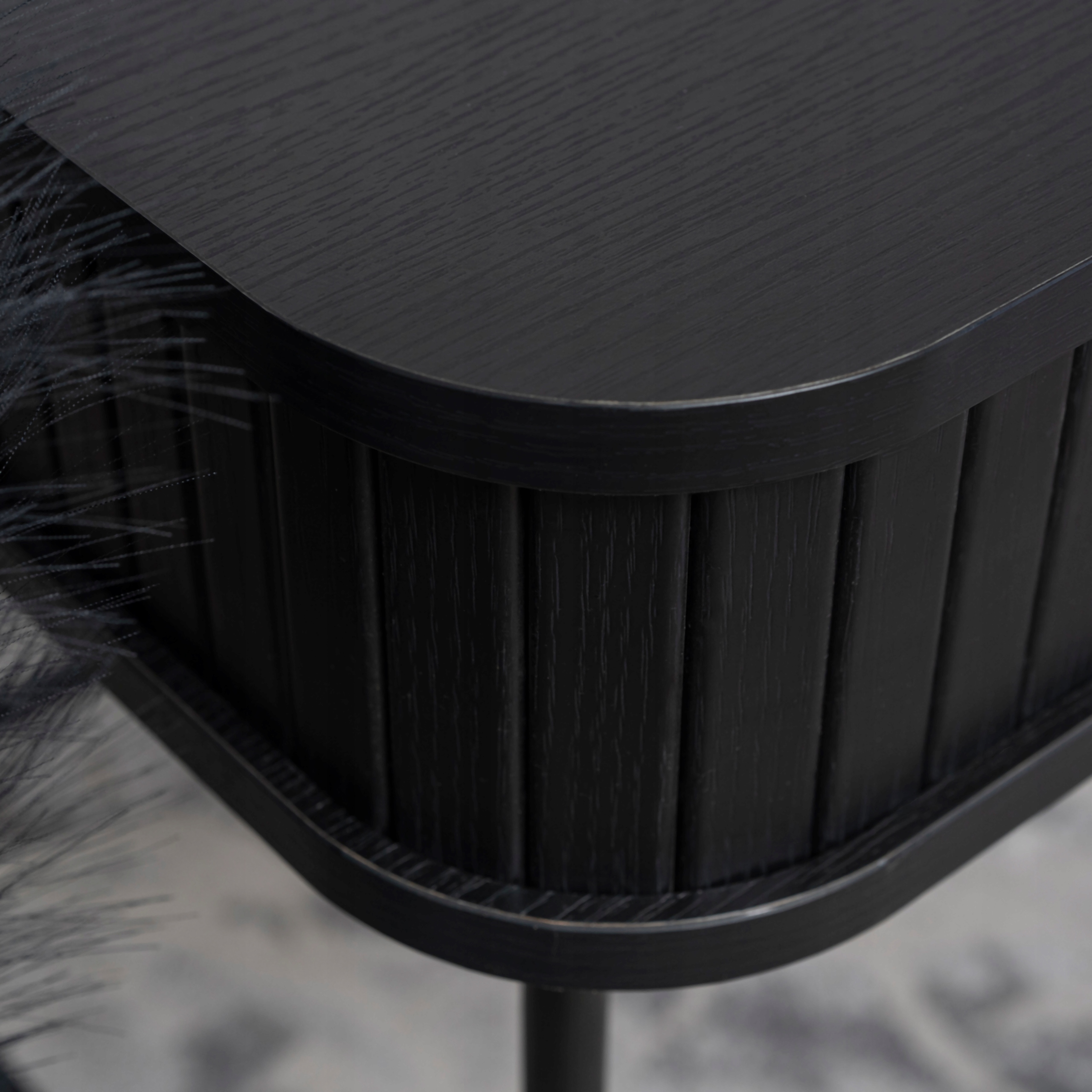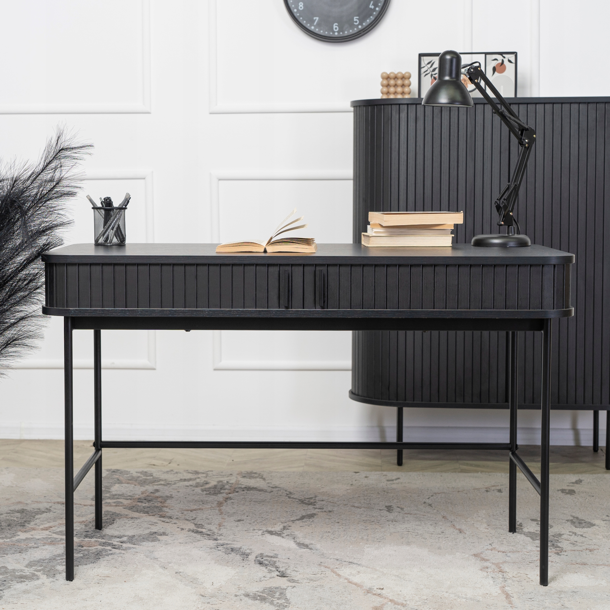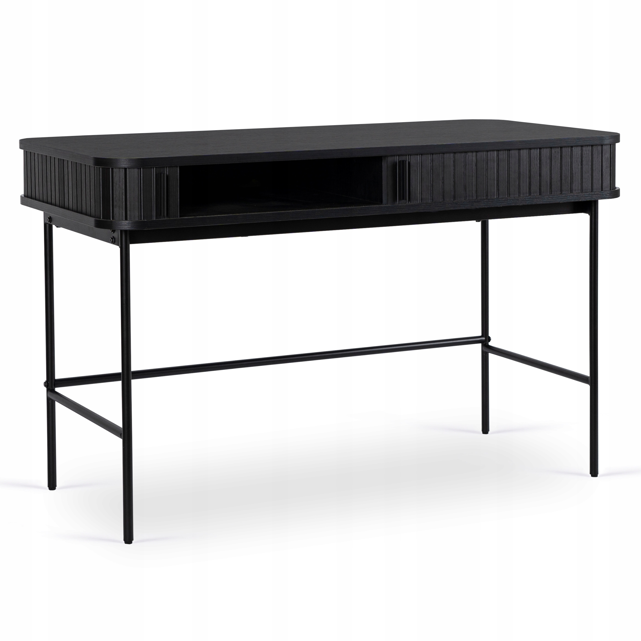 Biurko TRISH posiada dwa schowki do przechowywania różnych akcesoriów biurowych i dokumentów. Stylowe drzwiczki z lameli są rozsuwane i mają metalowe uchwyty.