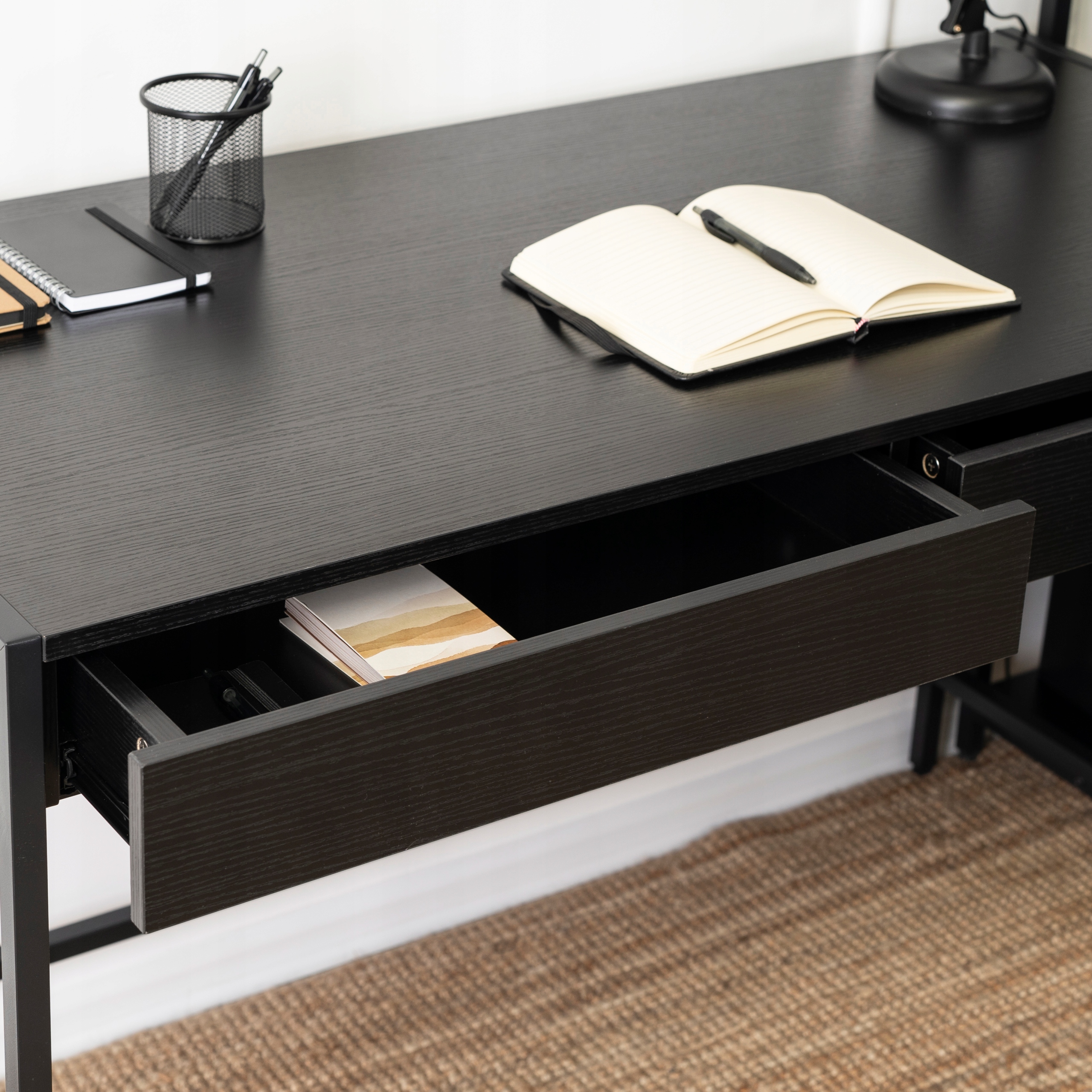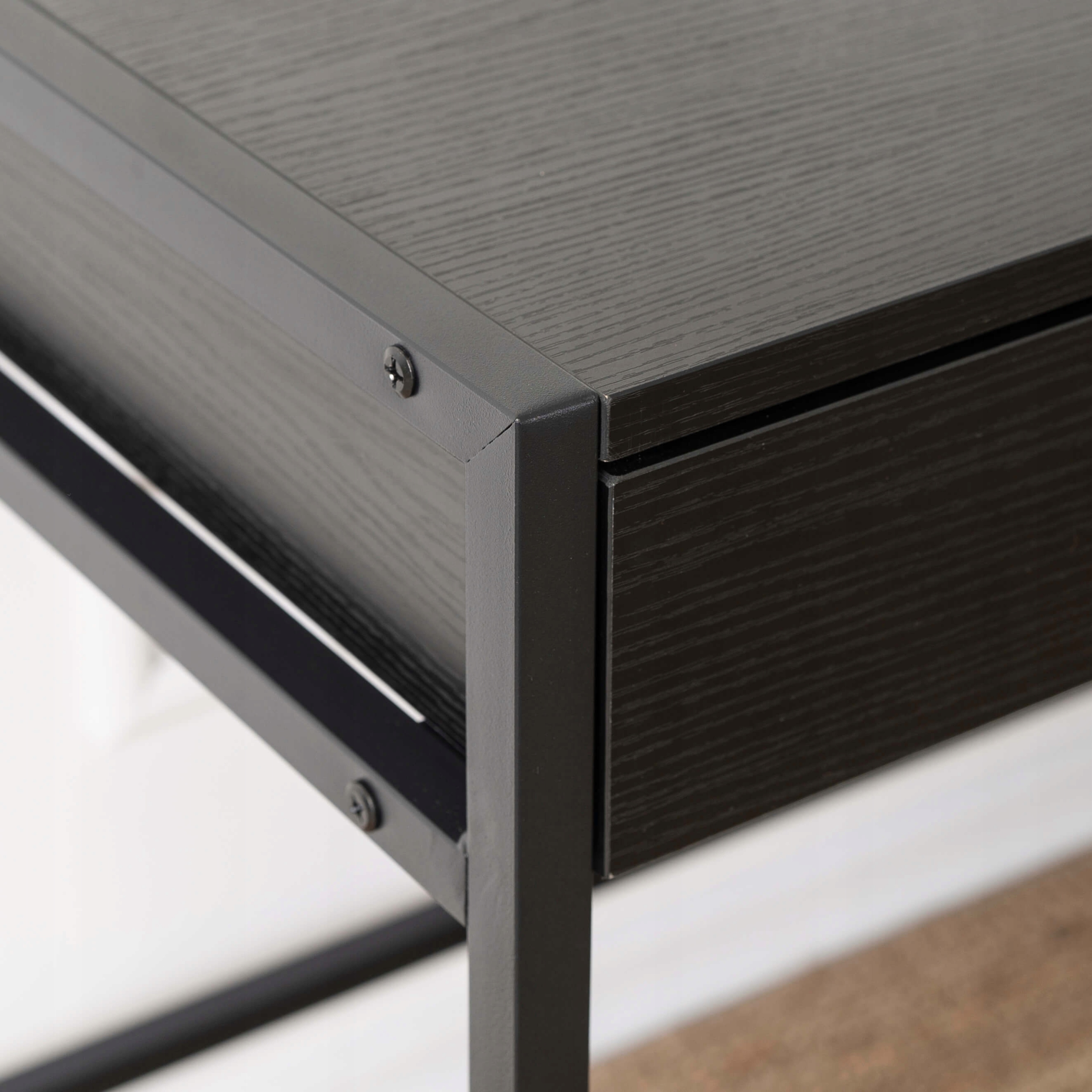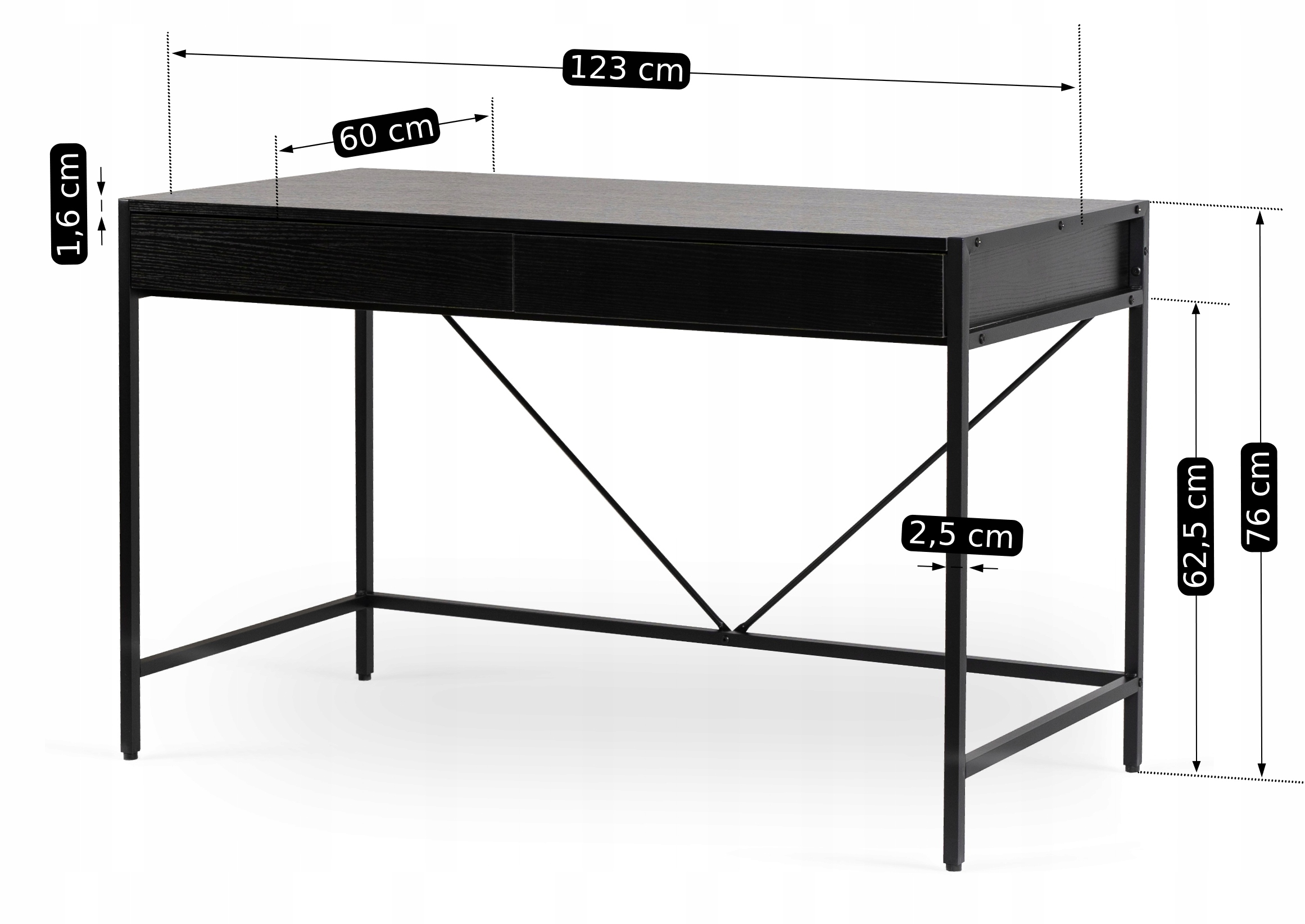 Blat wykonano z niezwykłą starannością. Wysokiej jakości płyta MDF, którą dodatkowo pokryto warstwą laminatu, obrzeża ABS,a także metalowy korpus w kolorze matowej czerni w efekcie sprawiają, że biurko prezentuje się bardzo ładnie.