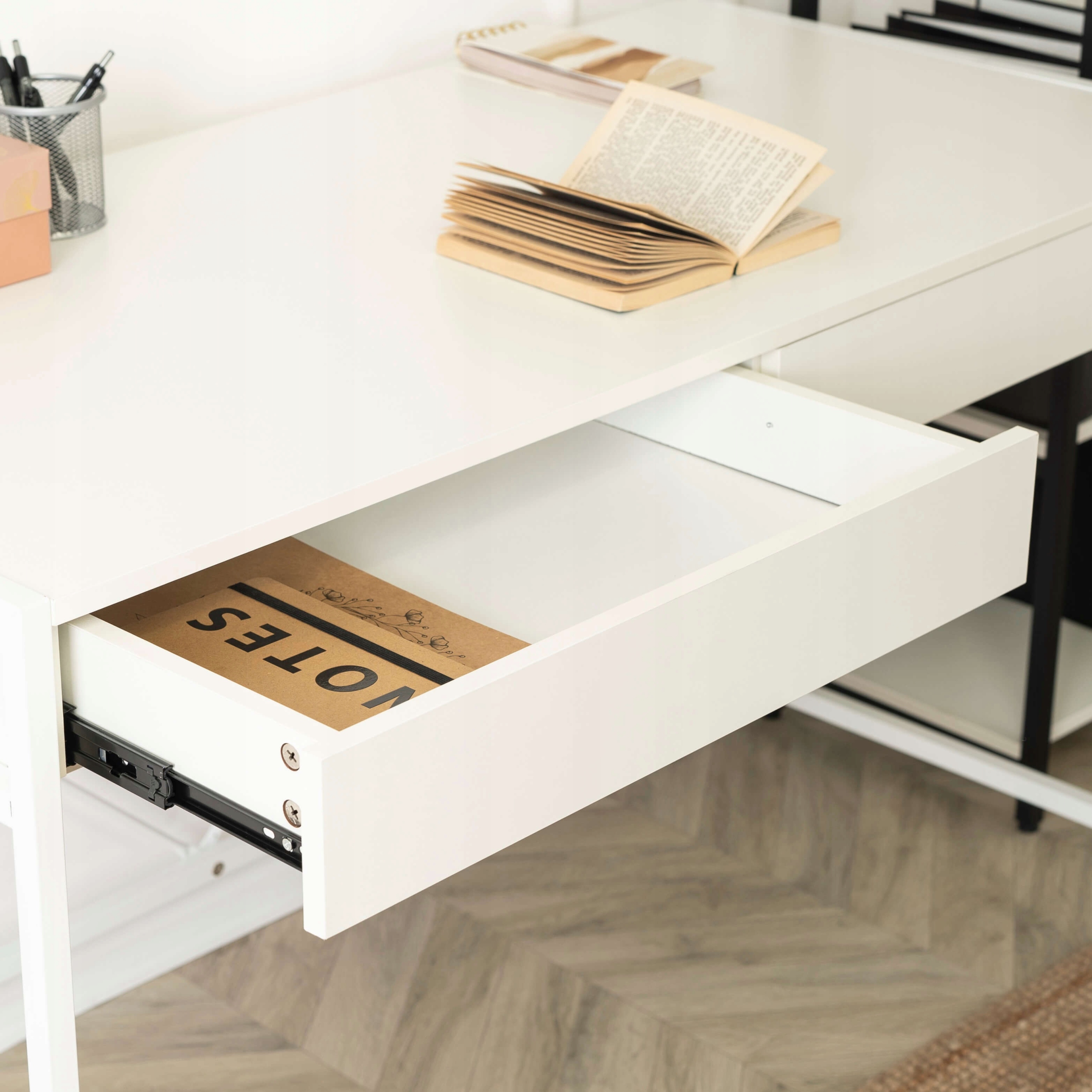 Blat wykonano z niezwykłą starannością. Wysokiej jakości płyta MDF, którą dodatkowo pokryto warstwą laminatu, obrzeża ABS, a także metalowy szkielet również w kolorze białym w efekcie sprawiają, że biurko prezentuje się bardzo ładnie.