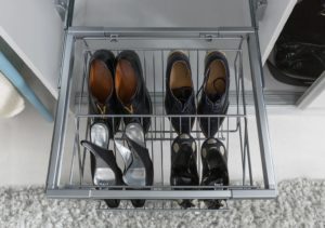 Jeżeli istnieje taka możliwość, jedno skrzydło mebla przeznacz na przechowywanie obuwia. Przydatne będą tutaj półki wyposażone w specjalne drążki, na które nakłada się każdy but oddzielnie. Do przechowywania wysokiego obuwia przydadzą się pojemne, metalowe kosze.