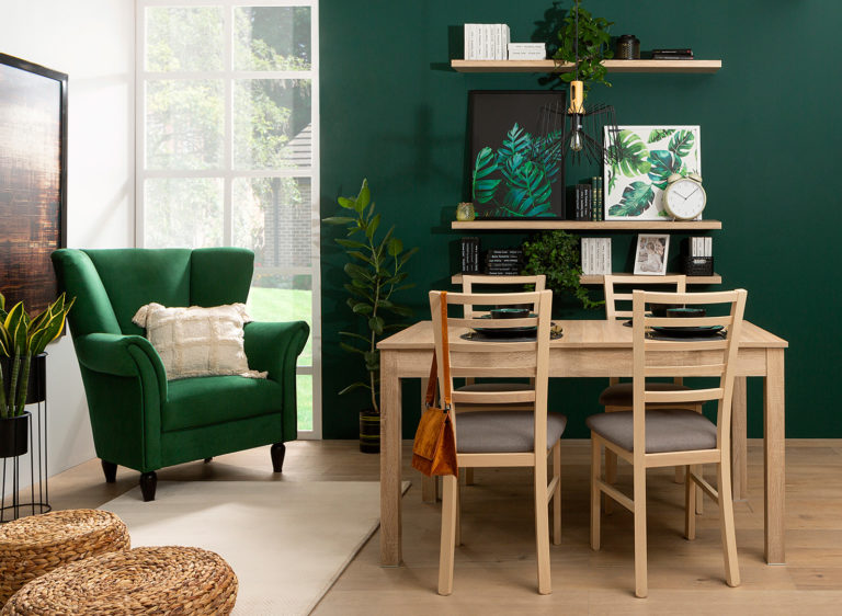 Kontrast w dosłownym znaczeniu tego słowa, tj. sprowadzający się do stworzenia pary przeciwstawnych sobie barw, to pewna droga do aranżacyjnego sukcesu. Jeśli Twoim zamiarem jest wizualne ocieplenie salonu, na ścianach może zagościć ciemny odcień czerwieni lub wibrująca musztardowa żółć. Funkcję elementu komplementarnego przejmie wówczas granatowy lub fioletowy narożnik. W wystroju bez przeszkód mogą pojawić się również akcenty tonujące całość – np. tekstylia w odcieniach szarości i drewniane dodatki.