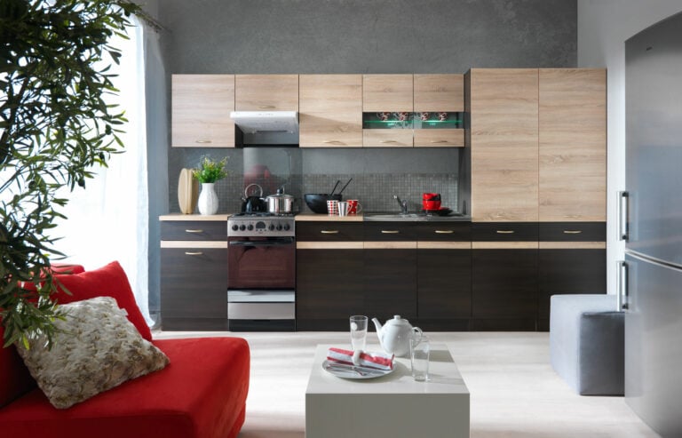Drugi pokój może stanowić połączenie kuchni z salonem. Jeśli pracujesz zdalnie, a metraż na to pozwoli, wstaw tam biurko z krzesłem obrotowym. Przyda się sofa z szafką RTV stojącą naprzeciwko niej, stolik kawowy obok oraz przynajmniej jeden fotel. Te elementy wyposażenia zapewnią Ci komfort w czasie odwiedzin znajomych czy wieczornych seansów filmowych.