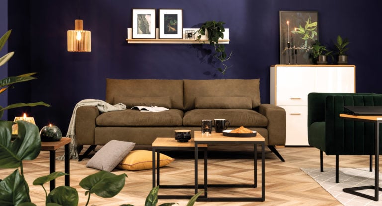 Złote odcienie obecne w żywym koralu predestynują go do eleganckiego towarzystwa. Dostojne, ciemne kolory typowe dla wytwornych wnętrz efektywnie współgrają z delikatnym i pastelowym koralem w wystroju wnętrz. Głęboki fiolet, charakterystyczne oświetlenie i stworzona przez projektantów BRW sofa Lisera łączą się w stylową, współczesną całość wykorzystującą modne kolory.