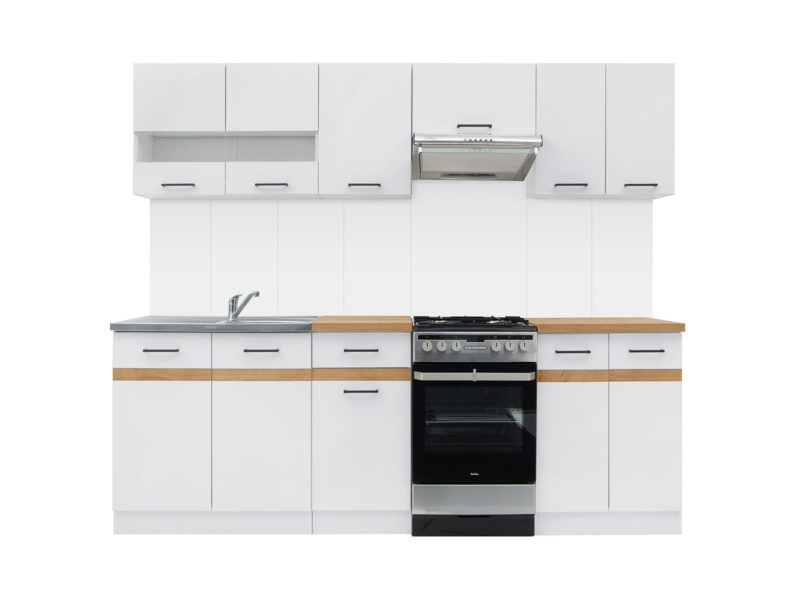 Jeśli nie posiadasz szczególnie dużo akcesoriów, dobrym pomysłem będzie także rezygnacja z górnej zabudowy, na rzecz prostych, pojedynczych szafek. Dzięki temu nadasz swojej kuchni przestronności oraz optycznie ją powiększysz. Jeśli jednak czujesz, że potrzebujesz więcej miejsca, postaw na  tworzący harmonijną całość komplet kuchenny.