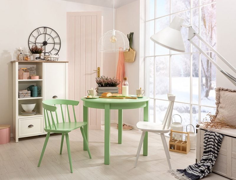 Pastelowa zieleń dodaje energii i odświeża aranżację, ale jest na tyle delikatna, że nie burzy harmonii uzyskanej za pomocą neutralnej kolorystyki (biele, szarości, beże). Neo mint to także symboliczny mariaż natury z technologią, więc pasuje zarówno do tradycyjnych mebli w kolorze drewna, jak i designerskich sprzętów na wysoki połysk.