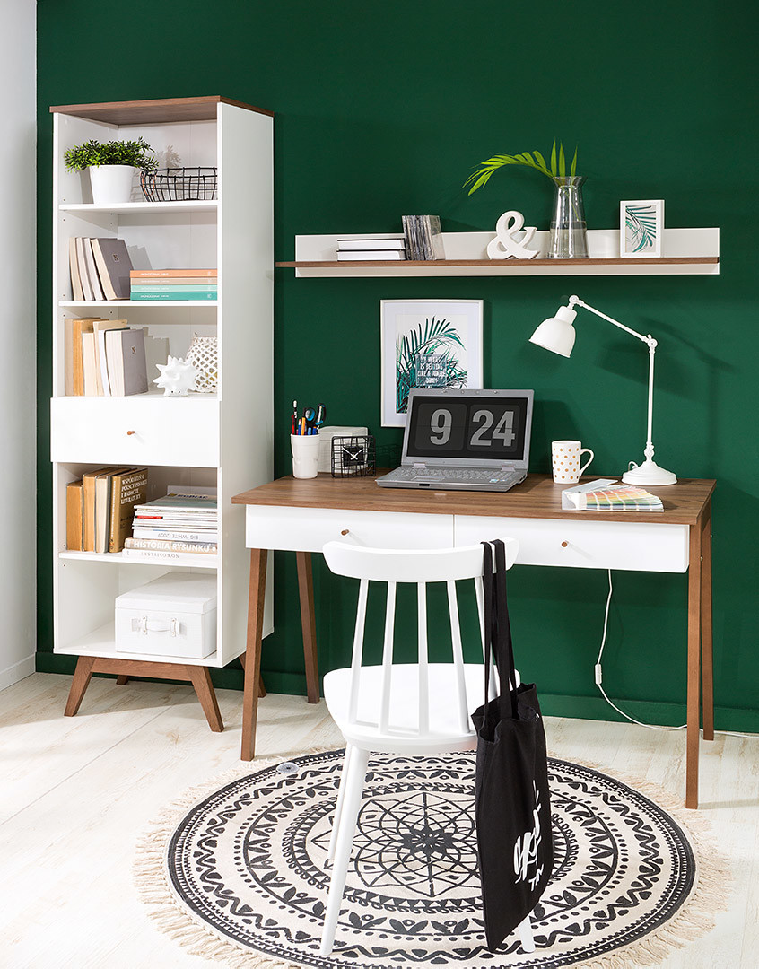 Pierwszym krokiem do stworzenia praktycznego kącika do pracy (lub nauki – zasady są analogiczne), w którym bez problemu będziesz mógł się skupić, jest wydzielenie go w widoczny sposób od reszty pomieszczenia. Prostym, a jednocześnie bardzo skutecznym sposobem na osiągnięcie zamierzonego efektu jest zastosowanie farby na ścianie w innym kolorze. Kącik do pracy warto zaznaczyć barwą mocno odcinającą się od reszty pomieszczenia, np. granatem lub zielenią.