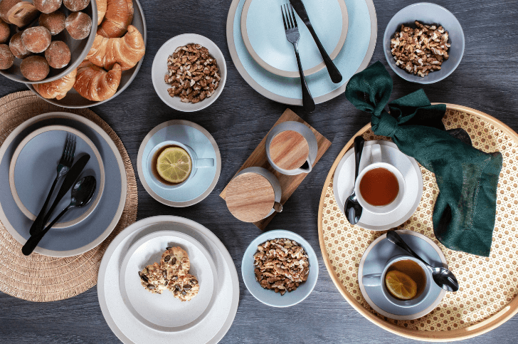 Botaniczne motywy to jednak nie tylko naturalne rośliny, ale również florystyczne wzory zdobiące tekstylia lub talerzyki – drobne łąkowe kwiaty i liście będą strzałem w dziesiątkę!