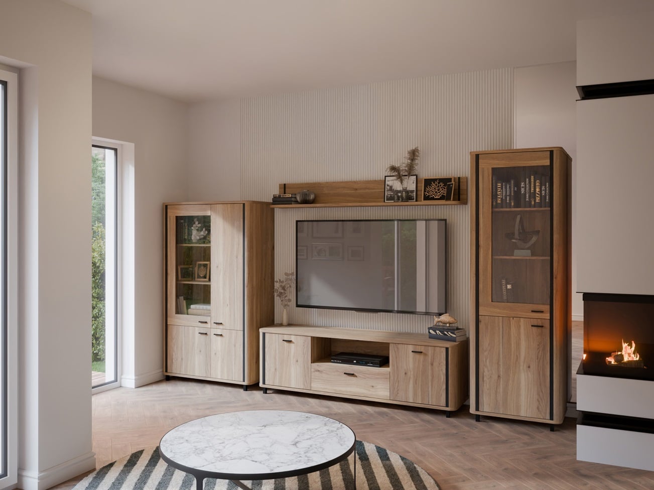 Jeśli preferujesz zabudowę, która prezentuje się lekko, postaw na meble zaprojektowane w stylu skandynawskim lub japandi. Do Twojej wizji salonu pasują bardziej masywne formy? Sięgnij po klasyczne propozycje o solidnej budowie i eleganckim wykończeniu. W salonie urządzanym z myślą o przyszłości egzamin zdadzą również minimalistyczne, białe meble. Wyposażenie o dyskretnej urodzie wprowadzi do wnętrza atmosferę spokoju.