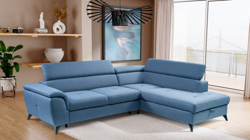 Aranżacja z narożnikiem Aldeia w roli głównej to kwintesencja nowoczesnej estetyki. Jest minimalistyczna, funkcjonalna i elegancka. Błękitna kanapa stanowi interesującą przeciwwagę dla przeważających w pomieszczeniu beży. Ożywia przestrzeń i przełamuje jej kolorystyczną monotonię. Czarna, futurystyczna lampa wisząca dopełnia wystrój, dodając mu charakteru.