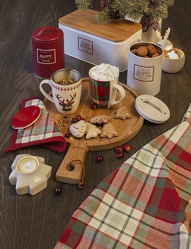 Dekoracje świąteczne salonu nie powinny ograniczać się do stołu. Warto otoczyć się zimowymi motywami i wzorami na każdym kroku. Pięknie wyglądać będą tematyczne pudełka do przechowywania jedzenia, ozdobne misy, kosze czy tace na owoce. Zabawne talerzyki czy kubki z motywami świątecznymi wniosą do Twojego domu dużo radości i bez wątpienia spodobają się zwłaszcza najmłodszym domownikom.