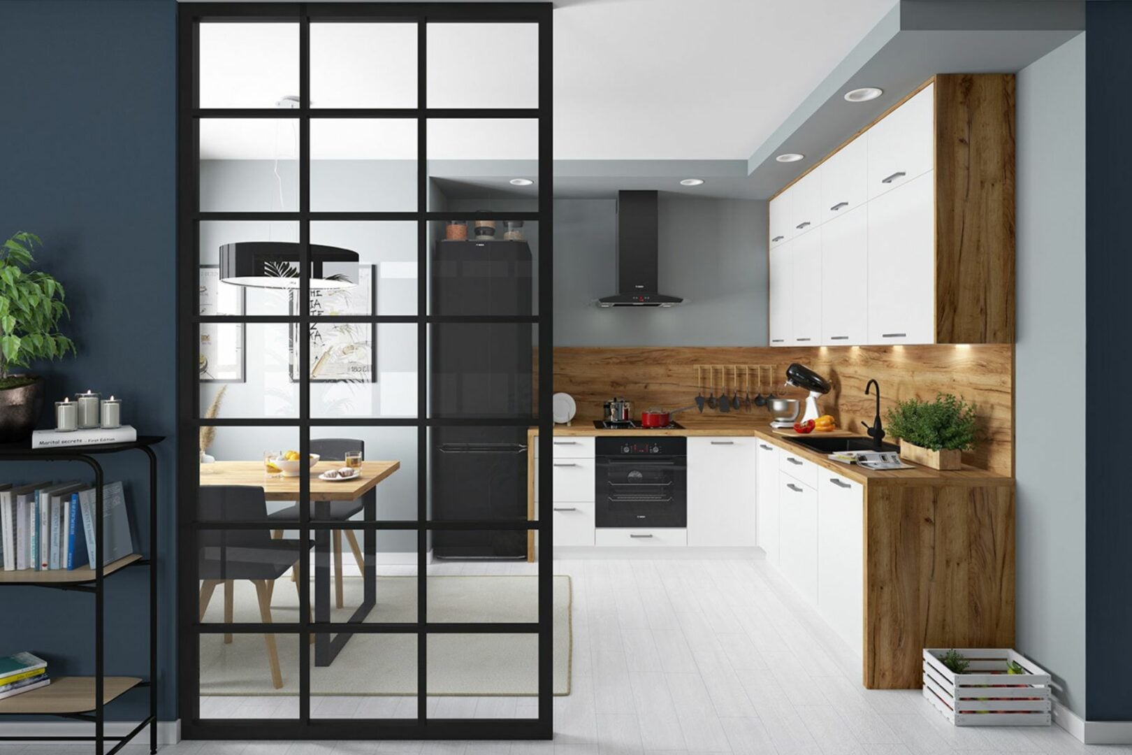 Estetyka loftowa to pierwsze rozwiązanie, które przychodzi do głowy na myśl o szklanych konstrukcjach w projekcie. Styl ten w atrakcyjny sposób łączy szkło, metal oraz surowe drewno. Decydując się na taką aranżację, pamiętaj o stonowanej kolorystyce pomieszczenia i surowym wystroju. Stawiaj na proste, geometryczne formy i minimalistyczny design. Szklane ścianki działowe w kuchni poskutkują optycznym powiększeniem przestrzeni, a to jeden z kluczowych wyznaczników stylu industrialnego.