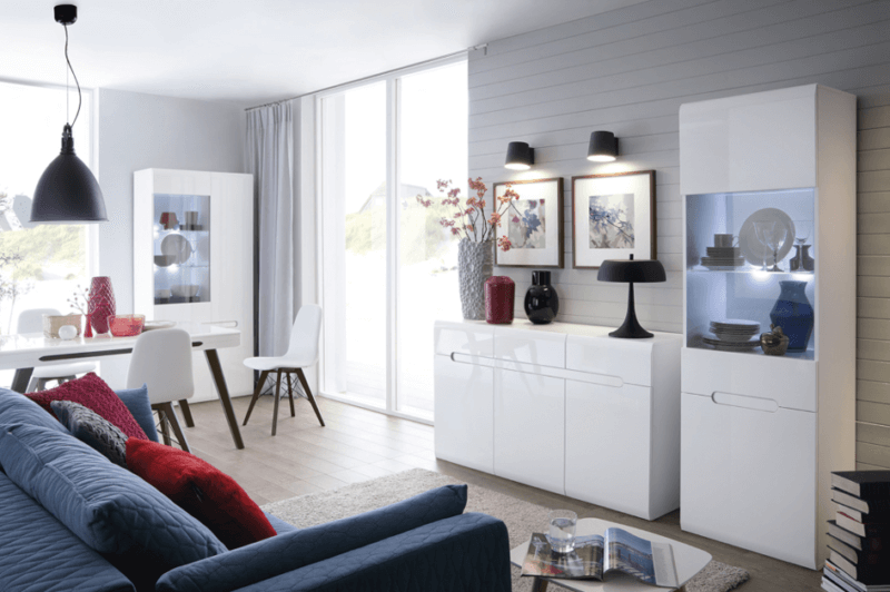 Zastosowanie mebli na wysoki połysk w salonie pozwala na jego optyczne powiększenie. Błyszczące fronty działają bowiem jak lustro, czyniąc pomieszczenia bardziej przestronnymi. Dlatego też tak ważny jest odpowiedni dobór i rozplanowanie oświetlenia, które dopełni całości tego typu aranżacji.
