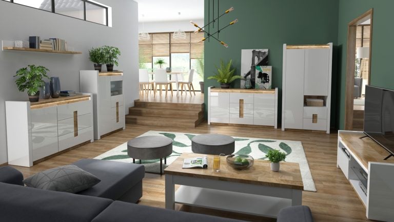 Przy tak odważnym duecie, pozwól sobie na nutkę szaleństwa w doborze pozostałych elementów wyposażenia. Drewniane półki czy komody o interesującym kształcie, kolorowe poduszki, ciekawe obrazy – połączenie tych akcesoriów sprawi, że Twoje wnętrze będzie promieniowało radością oraz pozytywną energią.